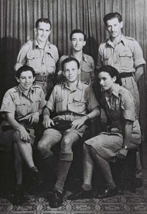 Skupinka židovských parašutistů v italském Bari v březnu či dubnu 1944. Chaviva Reiková sedí první zleva, přímo nad ní stojí Aba Berdičev