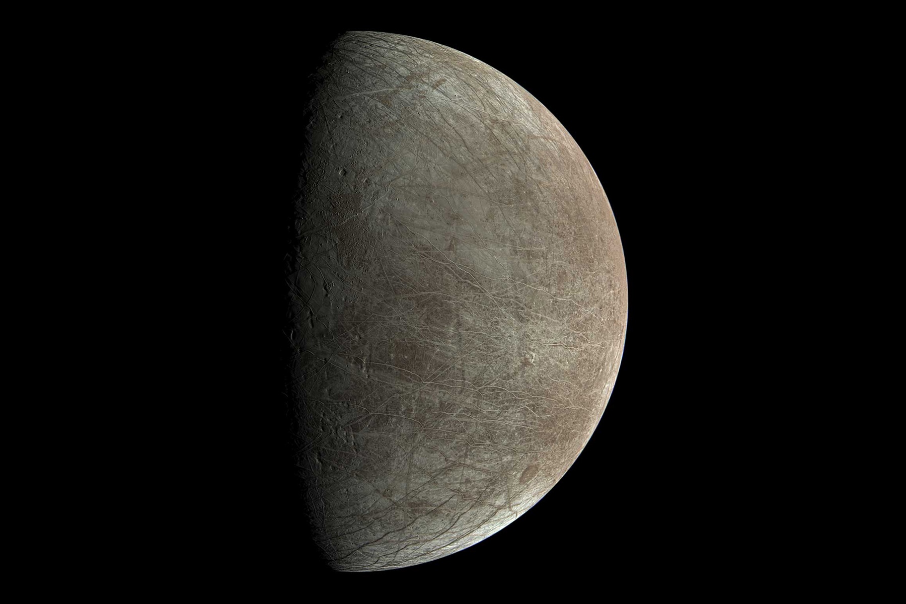 Jupiterův měsíc Europa okem meziplantární sondy Juno. (foto: NASA, JPL-Caltech, SwRI, Björn Jónsson, CC BY-NC-SA 2.0)