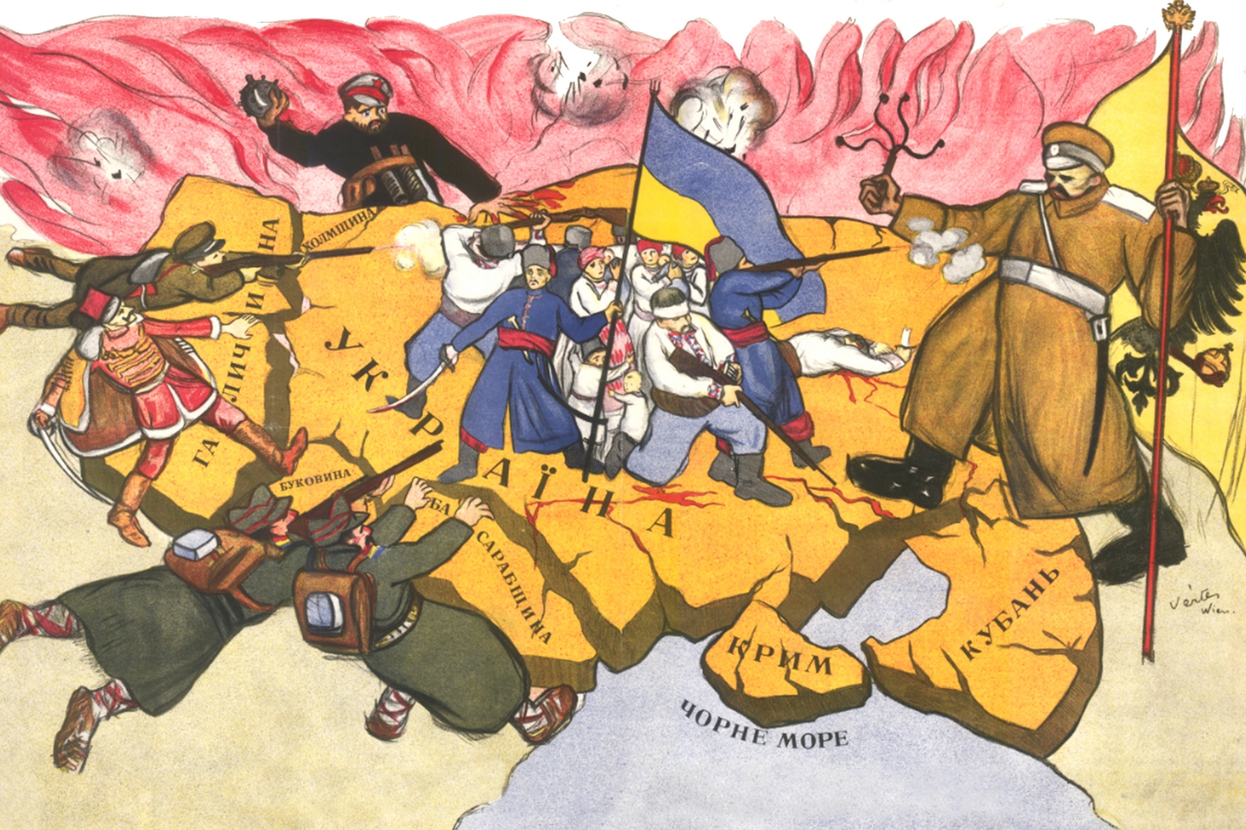 Karikatura nazvaná „Světový mír na Ukrajině“, publikovaná roku 1919, naráží na snahu země zachovat svoji nezávislost navzdory uchvatitelským snahám jejích sousedů. (ilustrace: Wikimedia Commons, Yuri Hasenko, CC0)