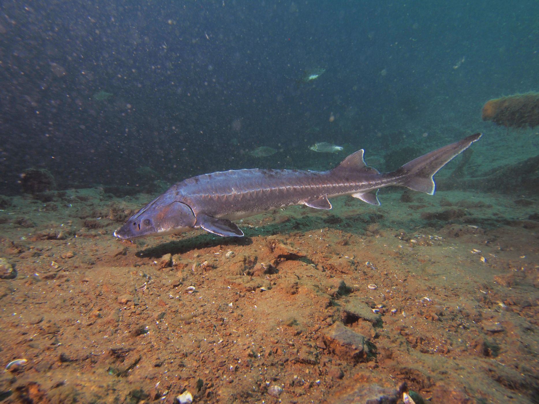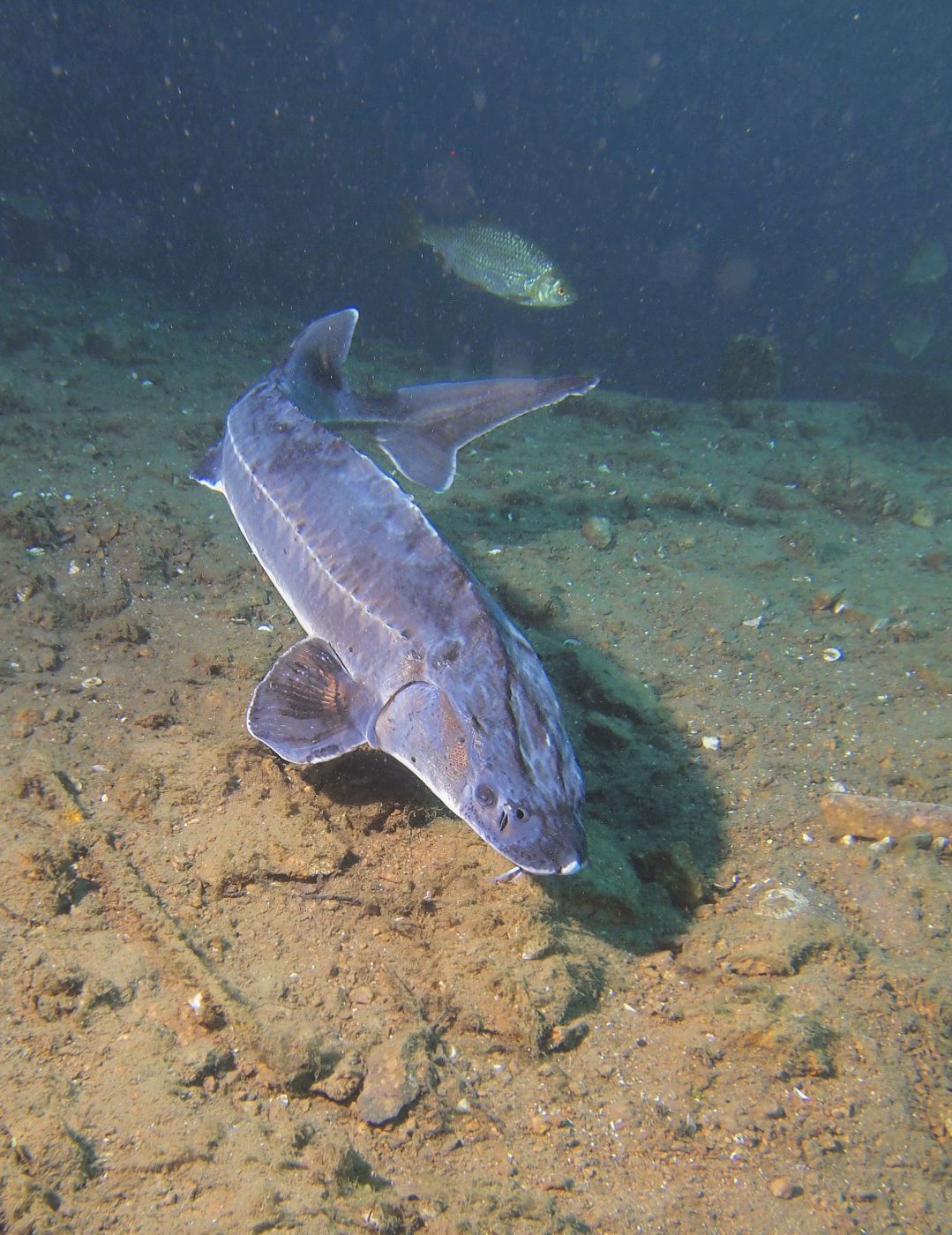 Přímý dotek lidské dlaně jeseterovi škodí, proto jsme pod vodou jen pouhými pozorovateli (lom u německého Lipska). (foto: © Nikita Nashipae Loxodonta)