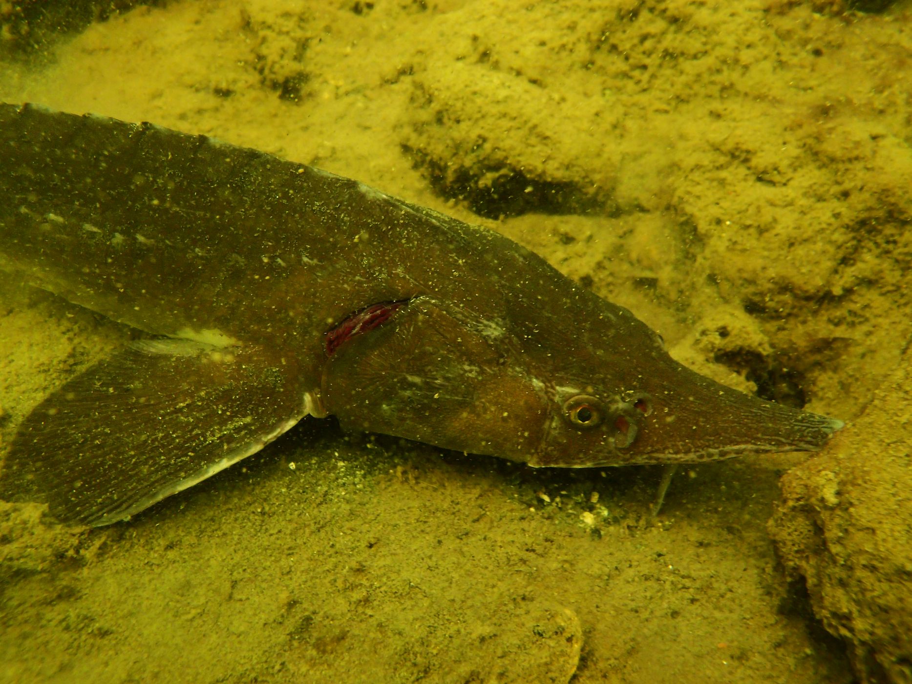 Takto jsme našli odpočívat zjevně unaveného jesetera, ale ne nade dnem, jak by se dalo očekávat, nýbrž na potopeném kesonu. Všimněte si detailu protáhlé hlavy (zatopený lom v Jižních Čechách). (foto: © Nikita Nashipae Loxodonta)