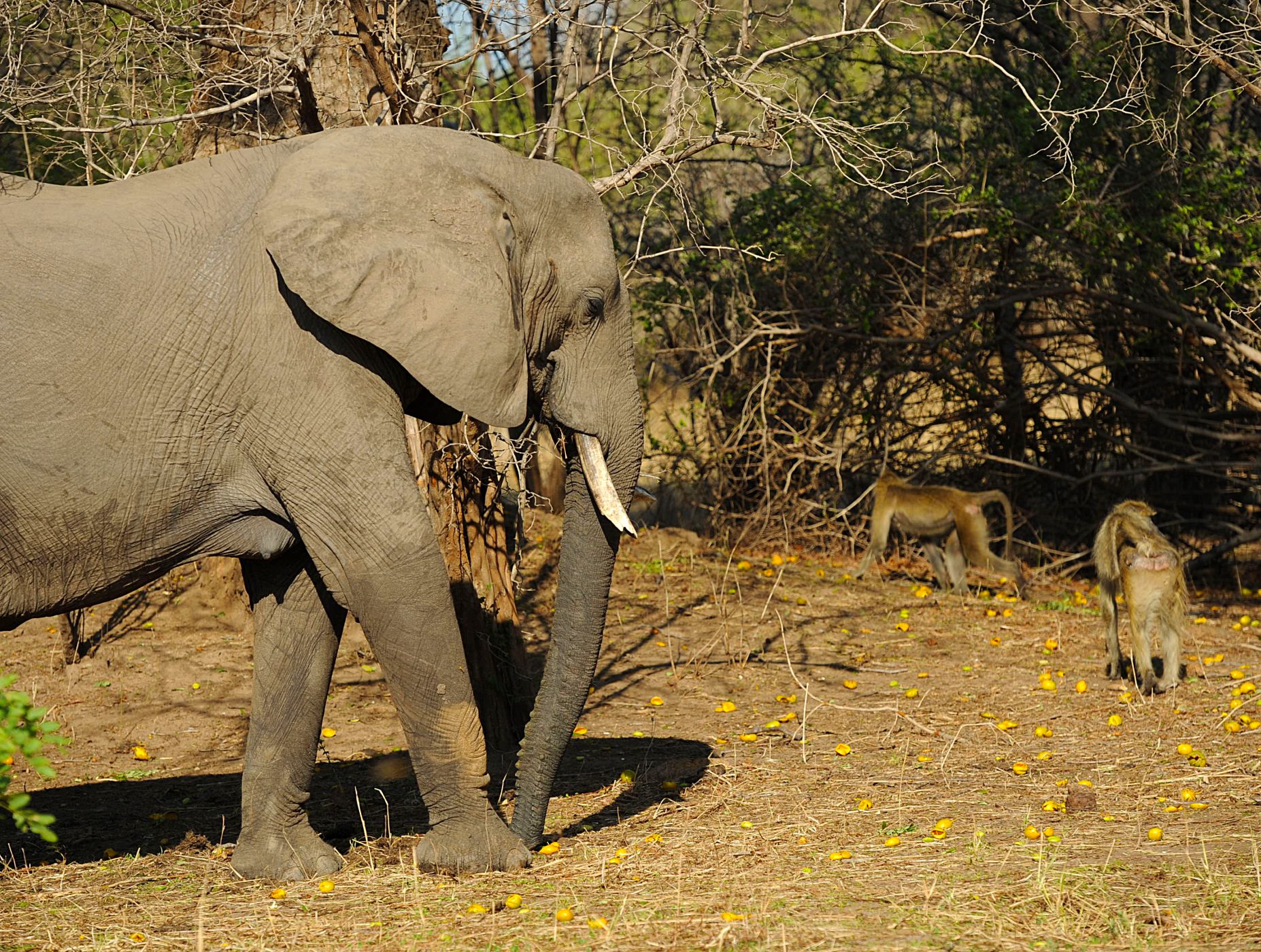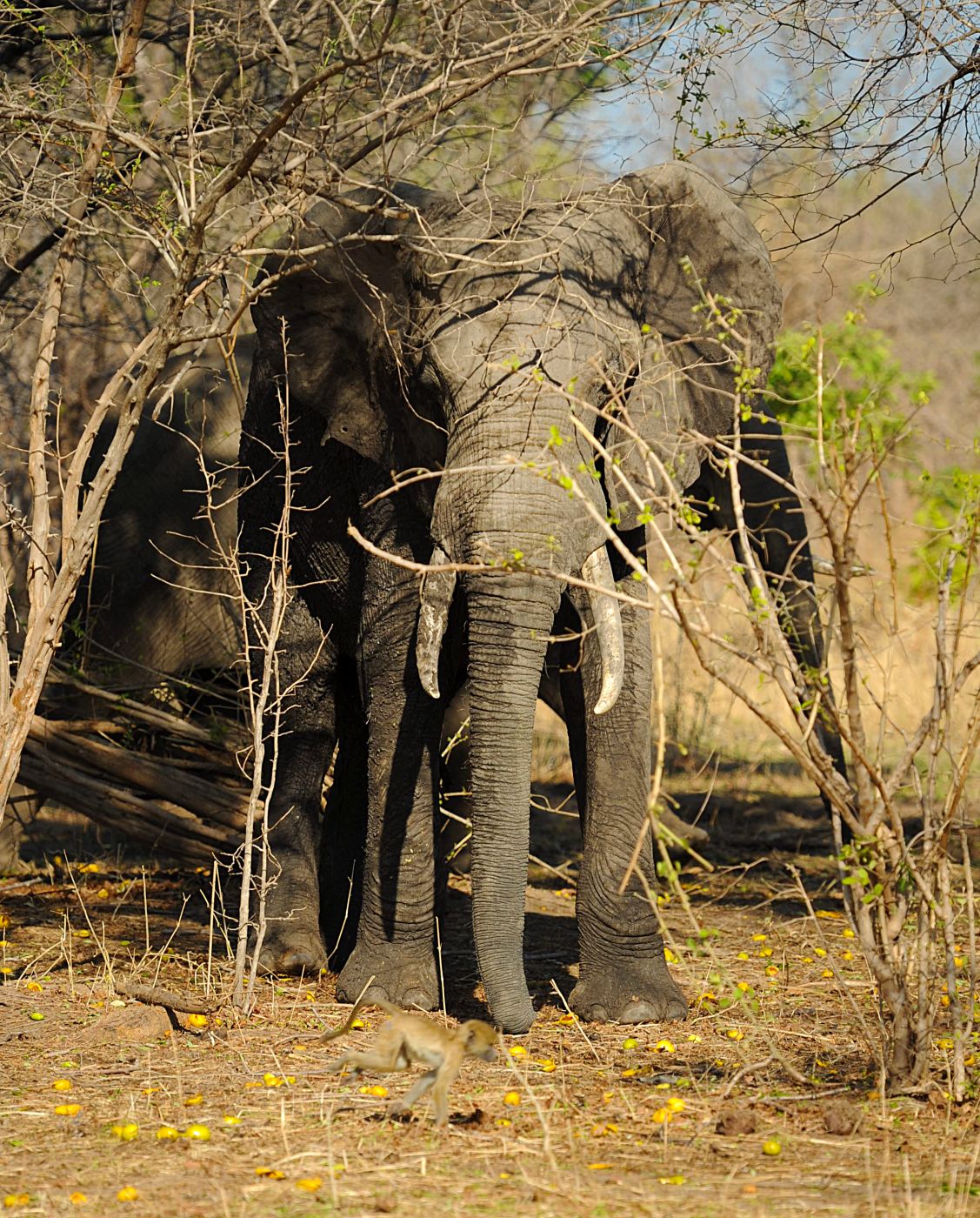 • Váhově nesrovnatelně těžším slonům se paviáni obloukem vyhýbali, ačkoli z bezpečí větví se rozčilovali v jednom kuse. (foto: © Richard Jaroněk)