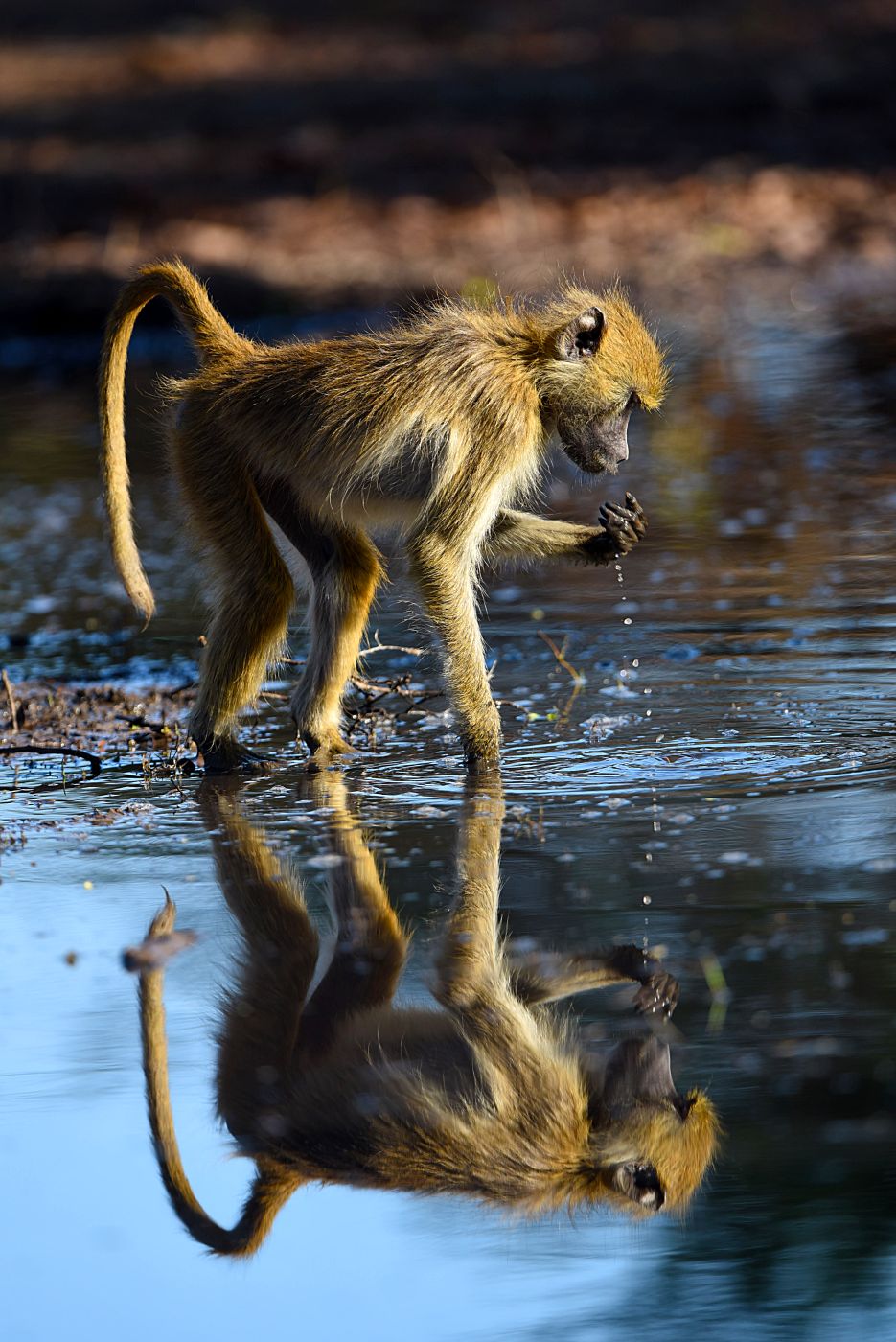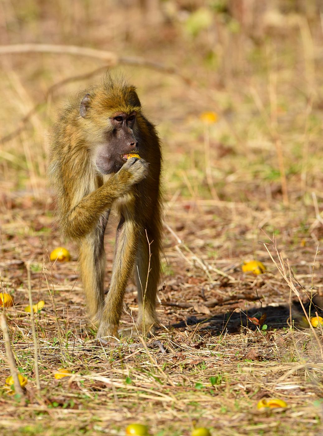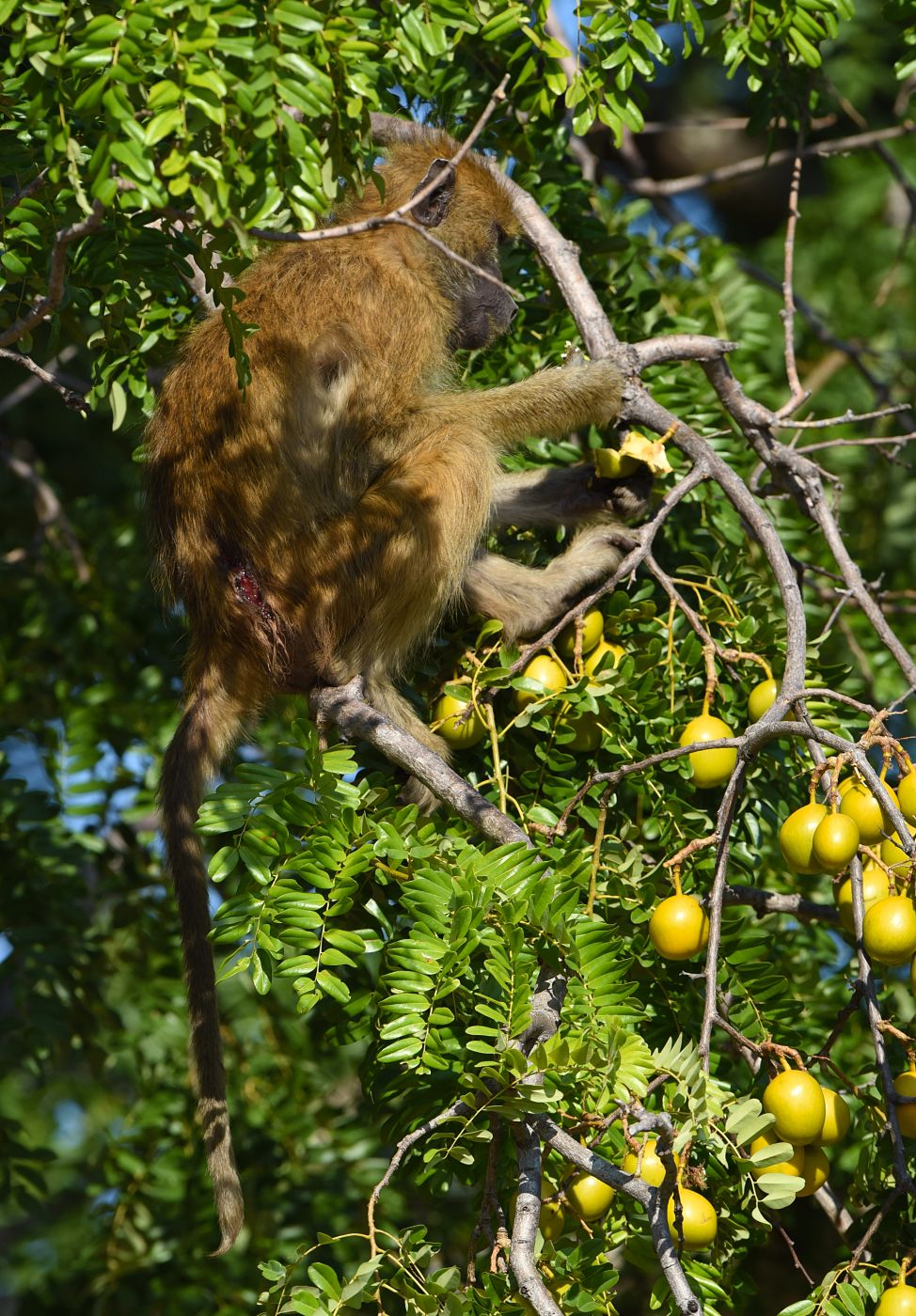 • Typické akrobatické podmínky, za nichž paviáni obírali zralé ovoce. Na krvavém zranění, které má tento jedinec blízko ocasu, je zároveň vidět, jak nekompromisní výměna názorů se občas mezi paviány odehraje. (foto: © Richard Jaroněk)