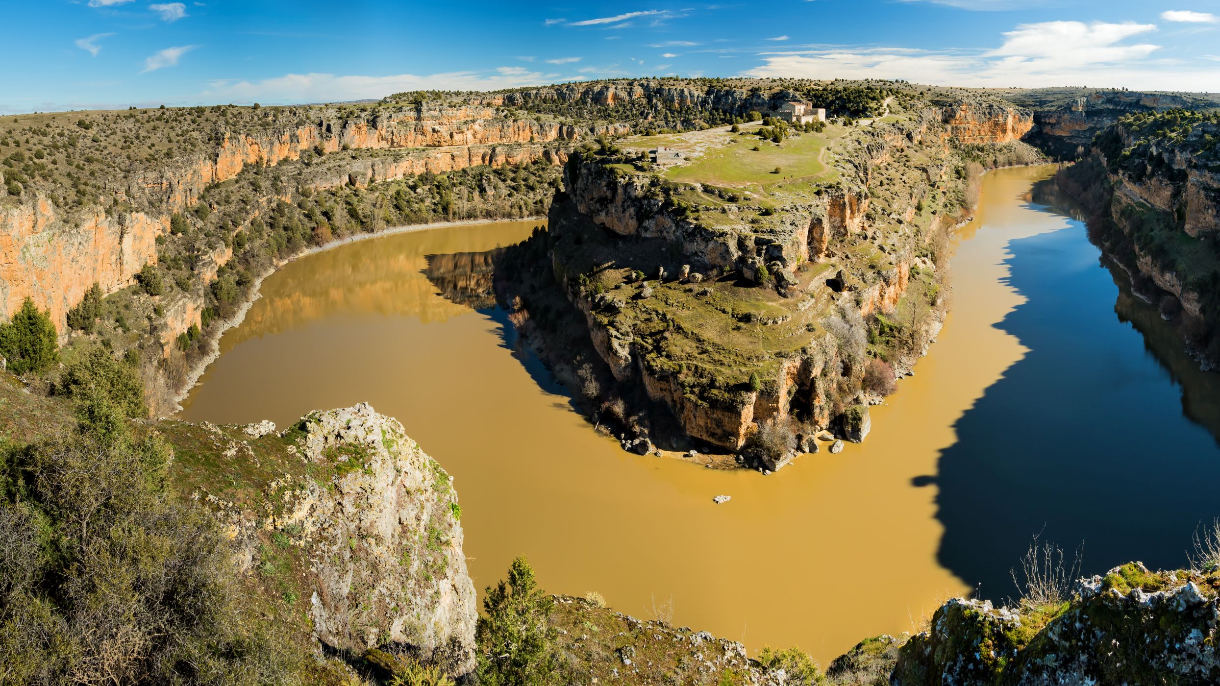 Pohled do kaňonu řeky Duratón z hrany meandru naproti kostela Ermita de San Frutos. Dávní poustevníci si vybrali skutečně impozantní místo. (foto: © Jan Miklín)