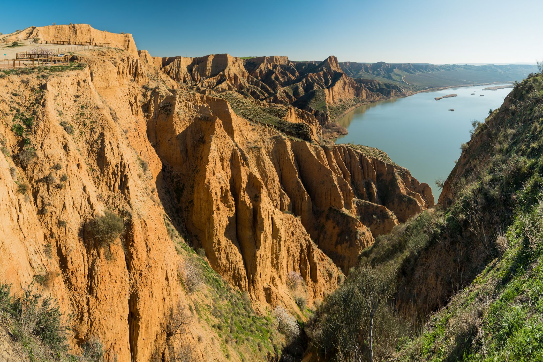 Políčka u přehrady Embalse de Castrejón jsou obdělávána až ke hraně svahu. Dál už spadají prudké útesy zerodovaných měkkých hornin. (foto: © Jan Miklín)