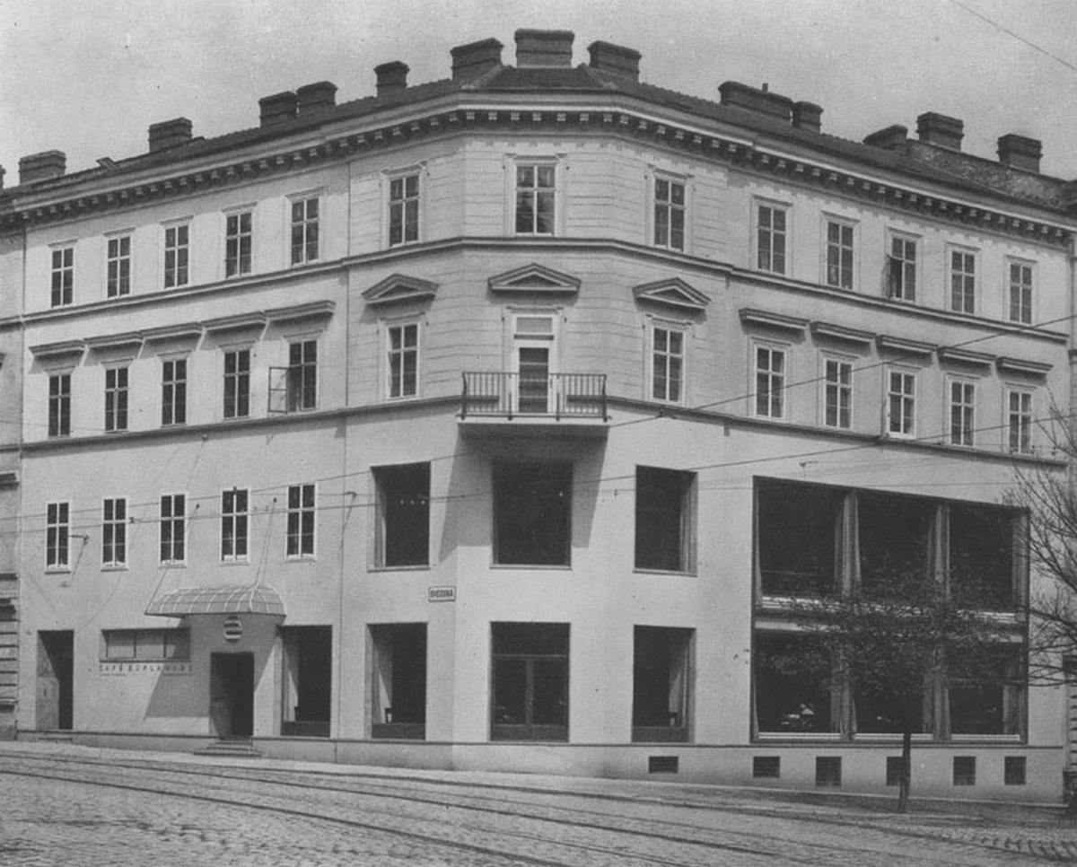 Kavárna se nacházela v suterénu, přízemí a prvním patře nárožního domu dnešní Rooseveltovy a Jezuitské ulice. (foto: Muzeum města Brna)