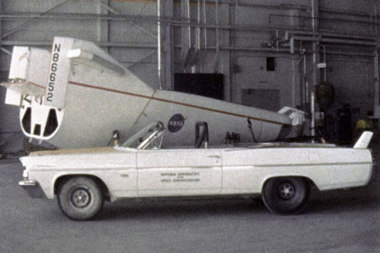 Na první pohled nenápadné, ale velmi výkonné vozidlo Pontiac Catalina ve službách NASA, v pozadí letoun M2-F1. (foto: NASA, CC0)