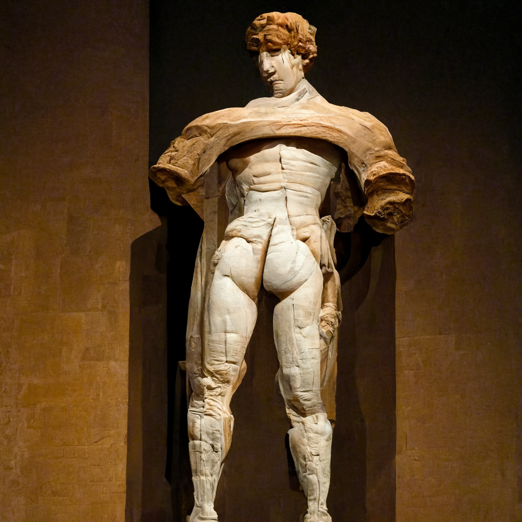 • Midjourney dostala jednoduchý úkol, obléct světoznámé Michelangelově soše Davida kalhoty. (ilustrace: Midjourney/Vilém Koubek)
