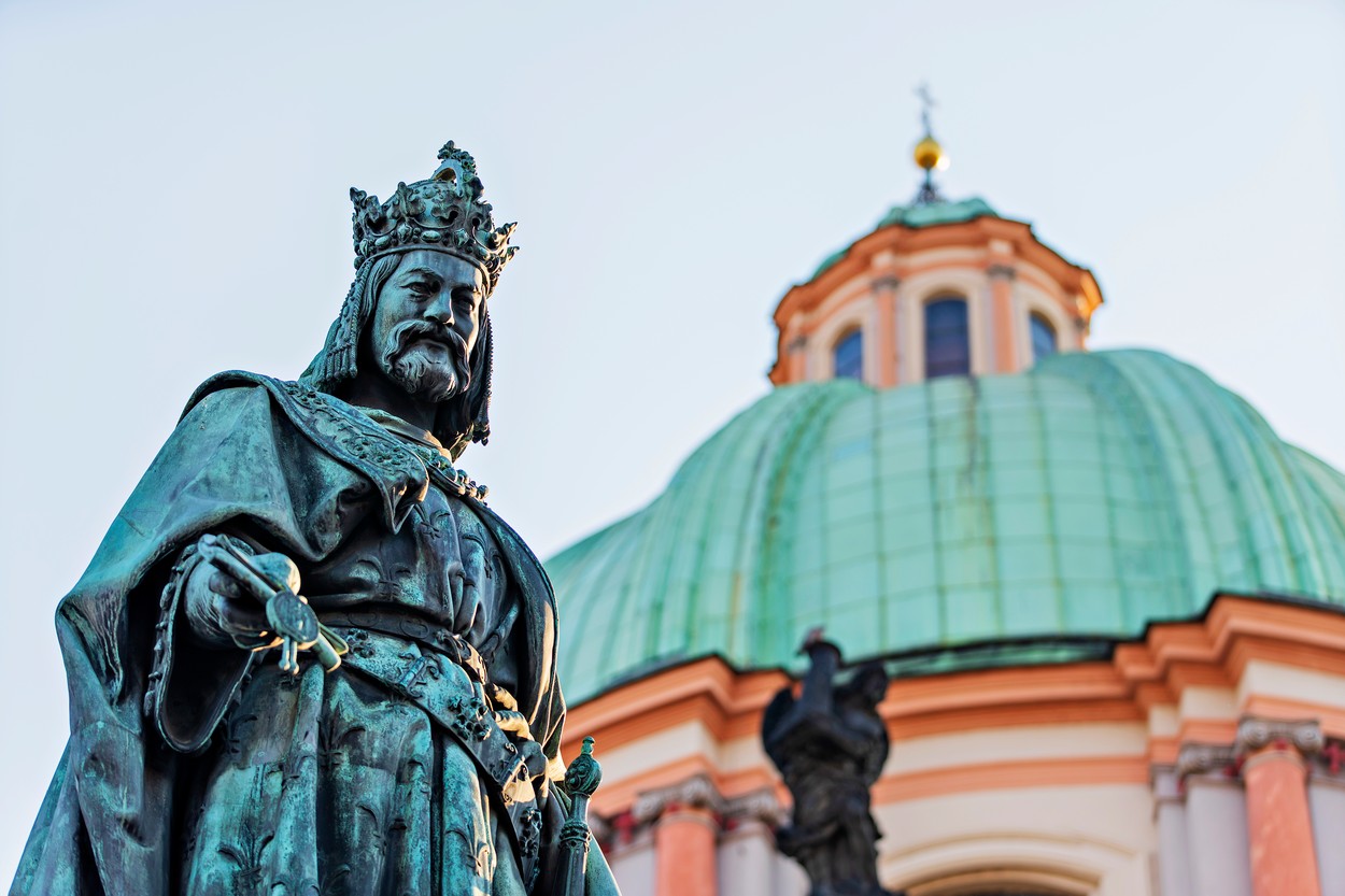 Socha Karla IV. na novogotickém bronzovém pomníku u kostela sv. Františka z Assisi na Křížovnickém náměstí na Starém Městě u Karlova mostu v Praze. (foto: Profimedia/ČTK)
