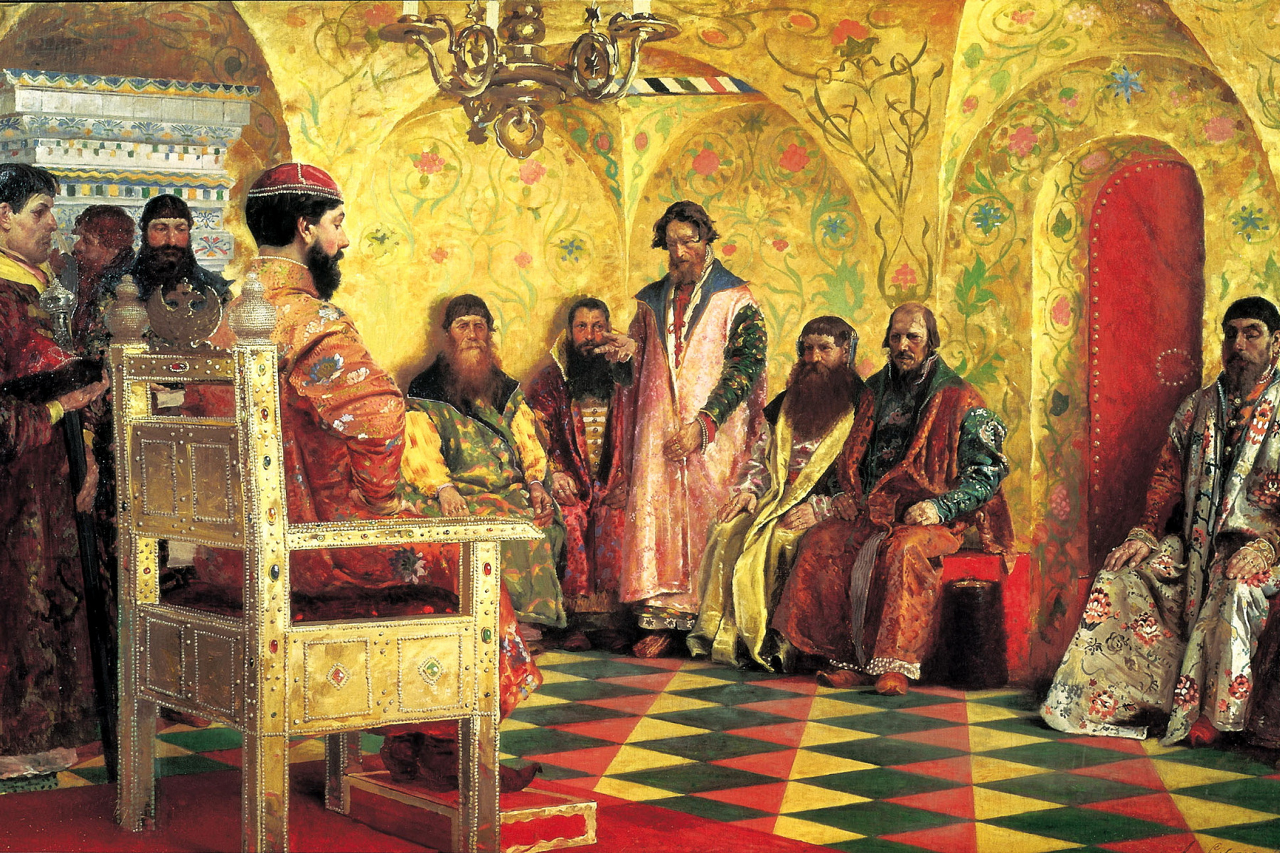 Michail Fjodorovič na shromáždění bojarské dumy (obraz od Andreje Rjabuškina, 1893). (zdroj: Wikimedia Commons, CC0)