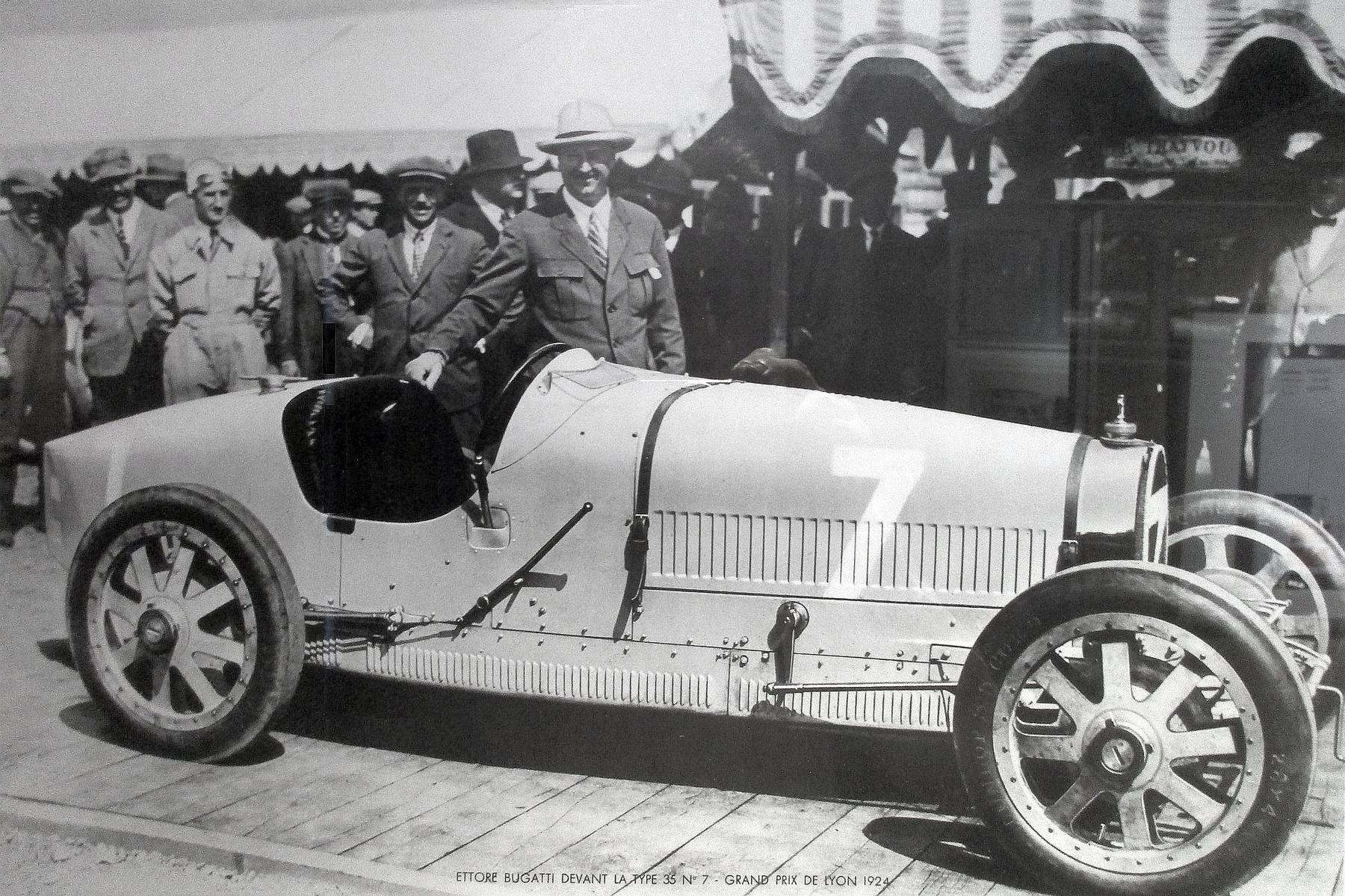 Ettore Bugatti s modelem Bugatti Type 35 n°7 během Velké ceny Lyonu v roce 1924. (foto: Wikimedia Commons, Arnaud 25, CC BY-SA 4.0)
