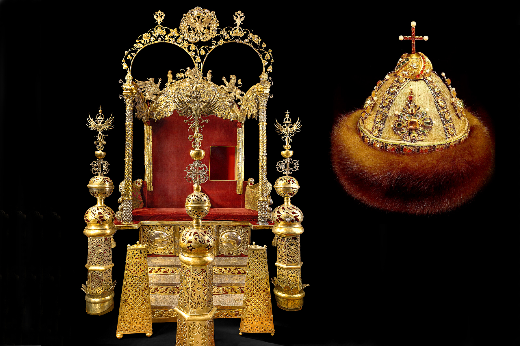 Trůn Ivana V. a Petra I. z roku 1682. Vpravo koruna z jemné látky s kožešinovým lemováním, zhotovená pro cara Ivana V. roku 1684. (foto: Moscow Kremlin Museums, CC0)