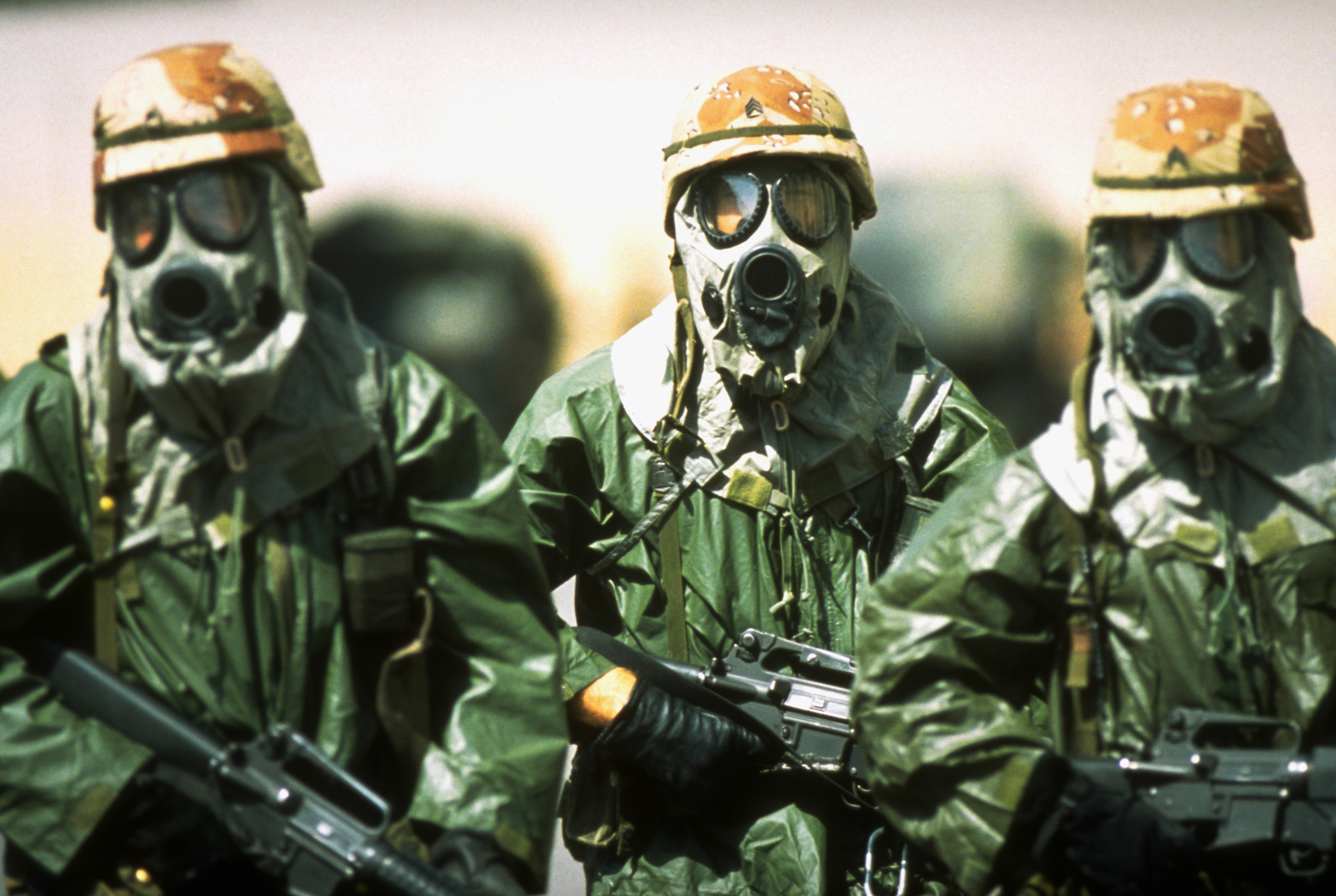 Že aklimatizace na odlišné podnebí představuje důležitý proces ovlivńující bojeschopnost vojáka, potvrzuje tento snímek pořízené během války v Perském zálivu v dubnu 1991. Tři vojáci od 82. výsadkářské divize chodí okolo svého tábora v Saúdské Arábii v nepromokavých pláštích, plynových maskách a rukavicích, aby se jejich tělo rychleji přizpůsobila horkému pouštnímu podnebí.