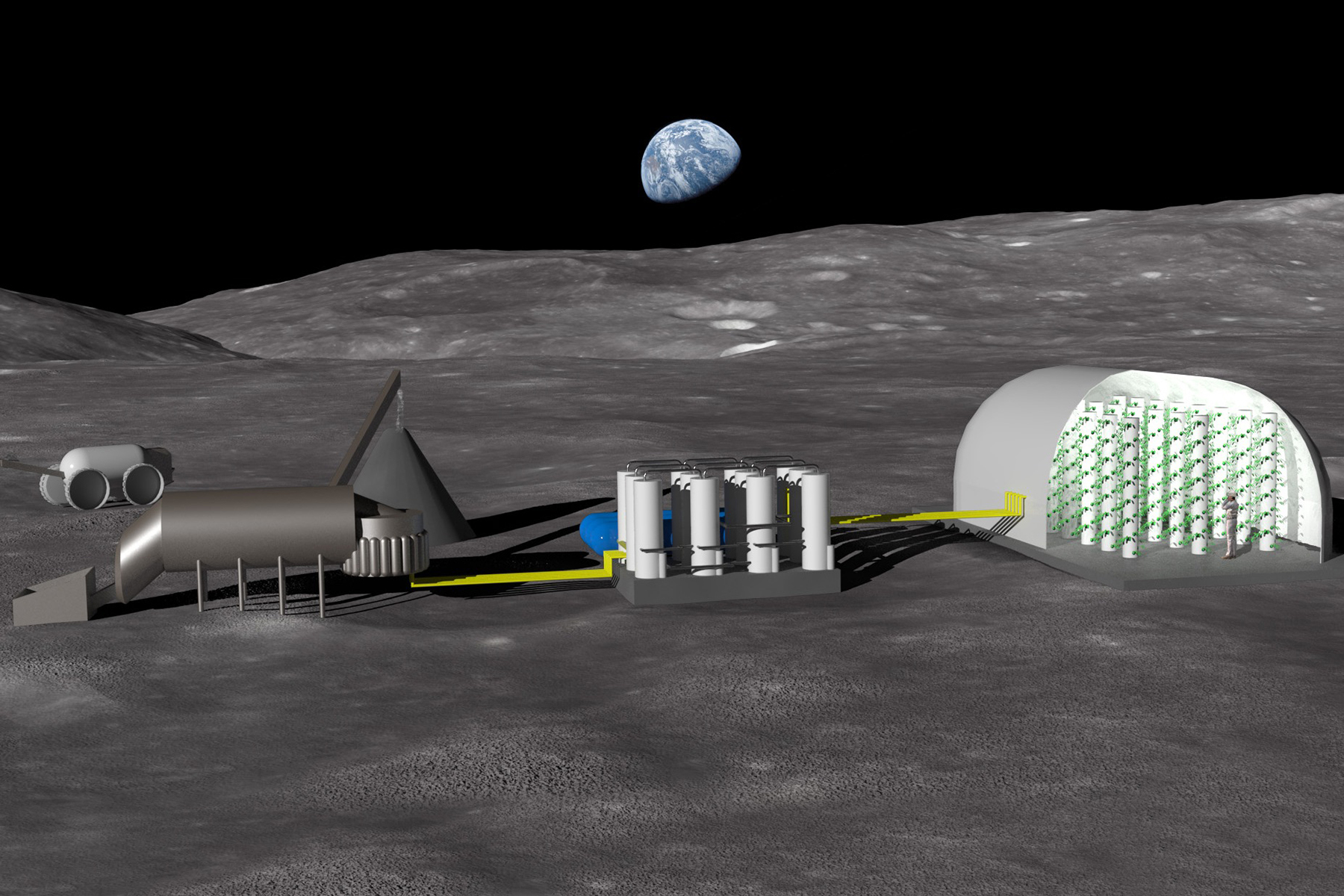 Vizualizace měsíční farmy – z třídící části (vlevo) by se regolit přesunul do centrálního modulu, kde by prošel procesem pokročilejšího zpracování (např. chemickým louhováním). Takto extrahované živiny by poté rozpuštěné ve vodě putovaly na hydroponickou farmu. (foto: ESA, Solsys Mining, CC BY 4.0)