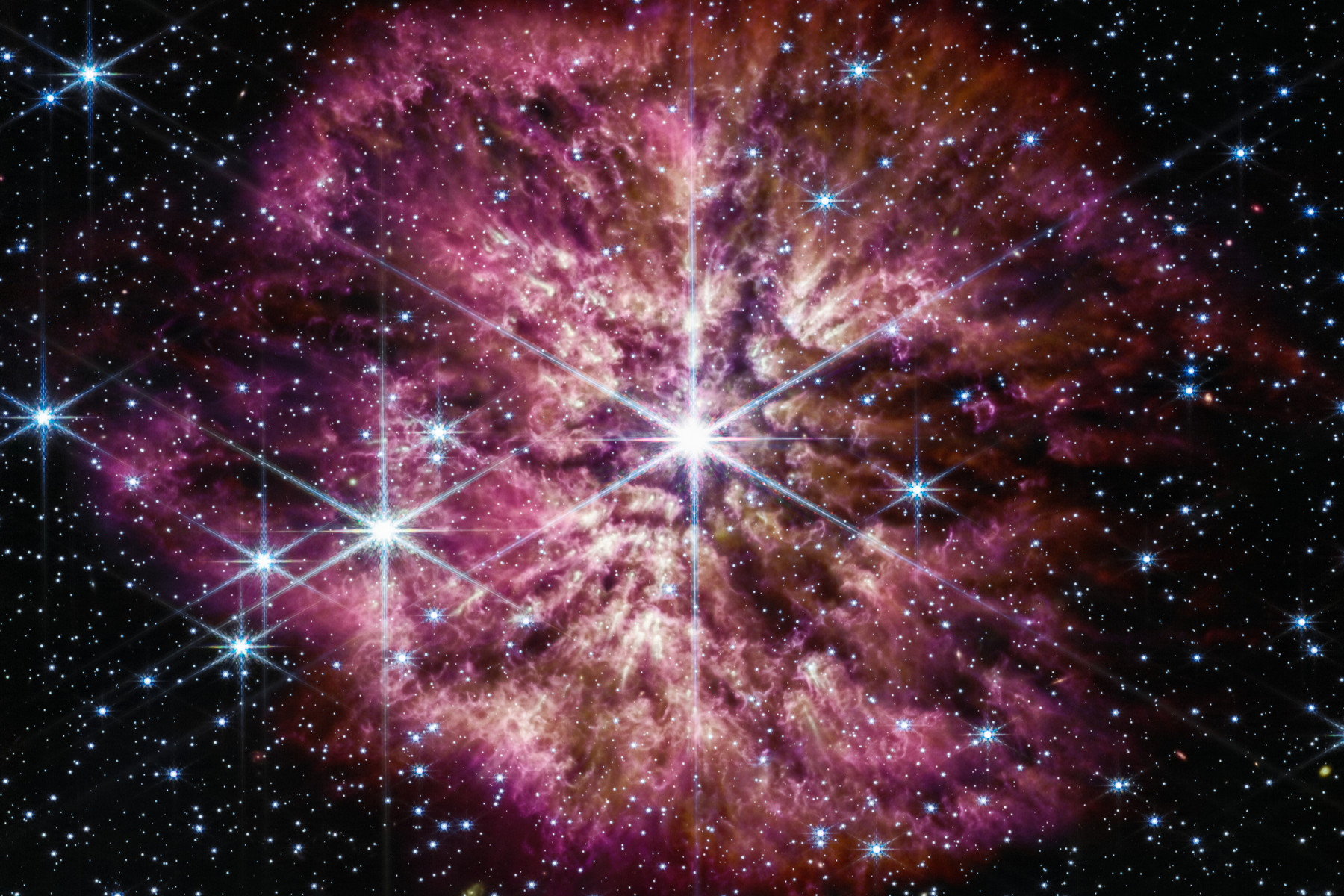 Kompozitní snímek Wolf-Rayetovy hvězdy WR 124. Wolf-Rayetova hvězda představuje závěrečnou fázi hvězdy, jejíž původní hmotnost byla asi 30 Sluncí. (foto: NASA, ESA, CSA, STScI, Webb ERO Production Team, CC BY 4.0)