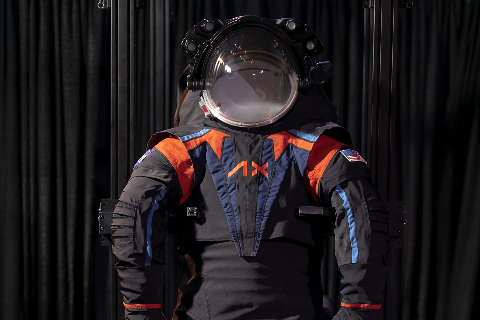 Prototyp skafandru AxEMU pro měsíční misi Artemis III. Finální verze bude pravděpodobně bílá. (foto: NASA/Axiom Space, CC BY 4.0)