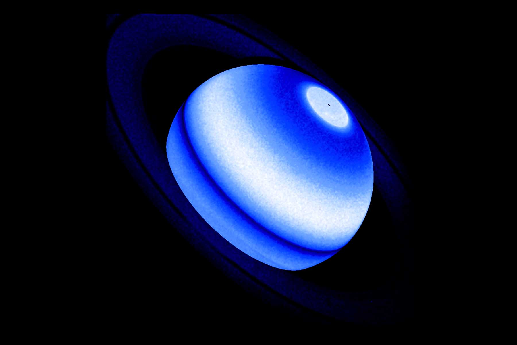 Snímek Saturnu v oblasti spektrální čáry Lyman-alfa, která je součástí oblasti ultrafialového záření. (foto: NASA, ESA, Lotfi Ben-Jaffel (IAP & LPL), CC BY-SA 4.0)
