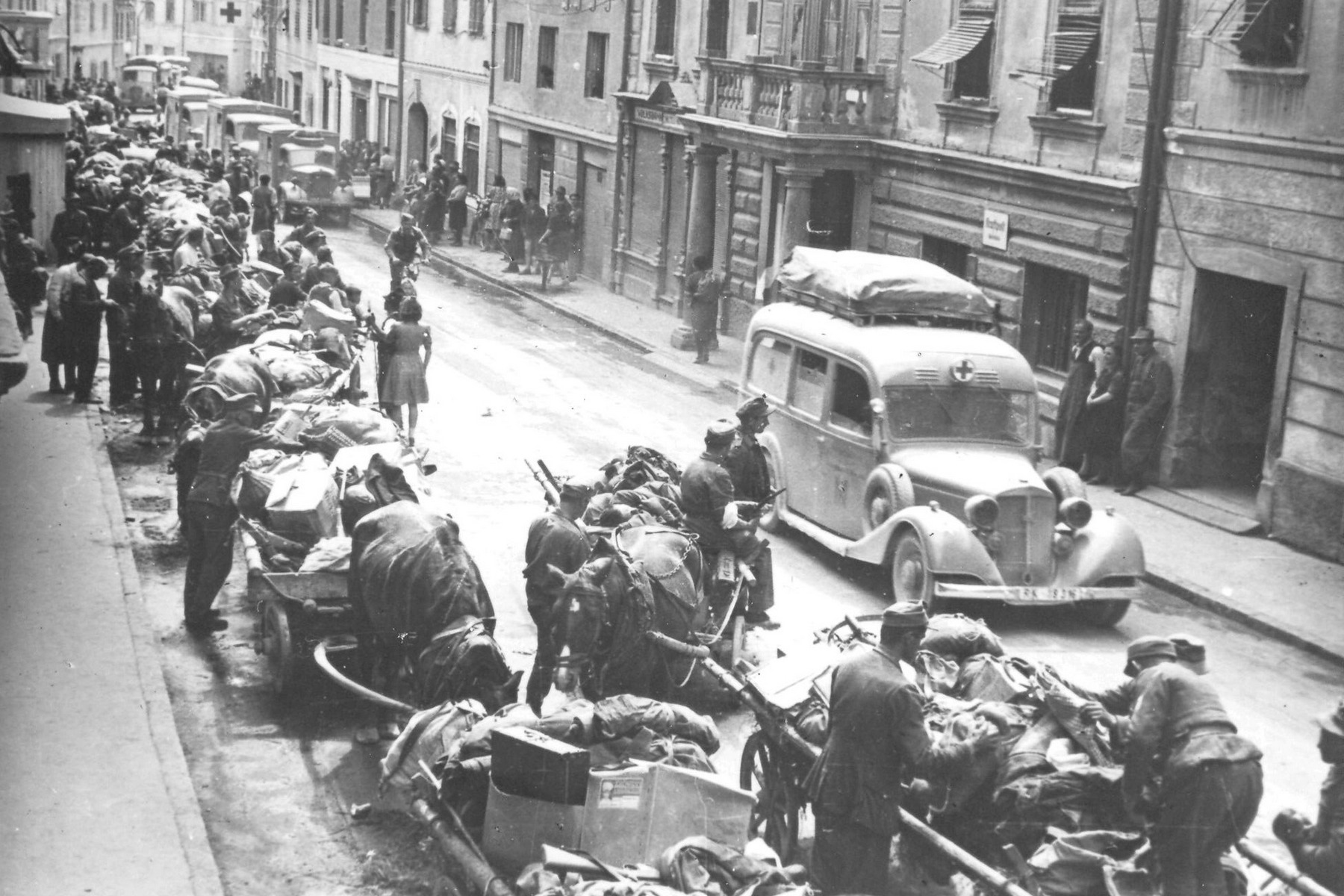 Příslušníci Slovinské domobrany a němečtí vojáci ustupují přes Tržič směrem na průsmyk Loibl (foto: Wikimedia Commons, CC0)