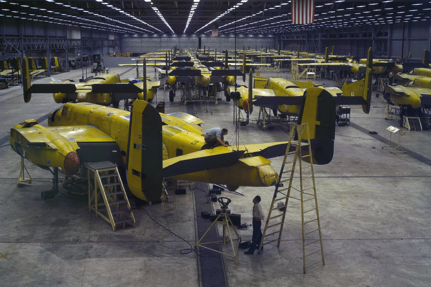 Pohled na montáž amerických bombardérů B-25 Mitchell. (foto: Wikimedia Commons, Library of Congress, Alfred T. Palmer, CC0)