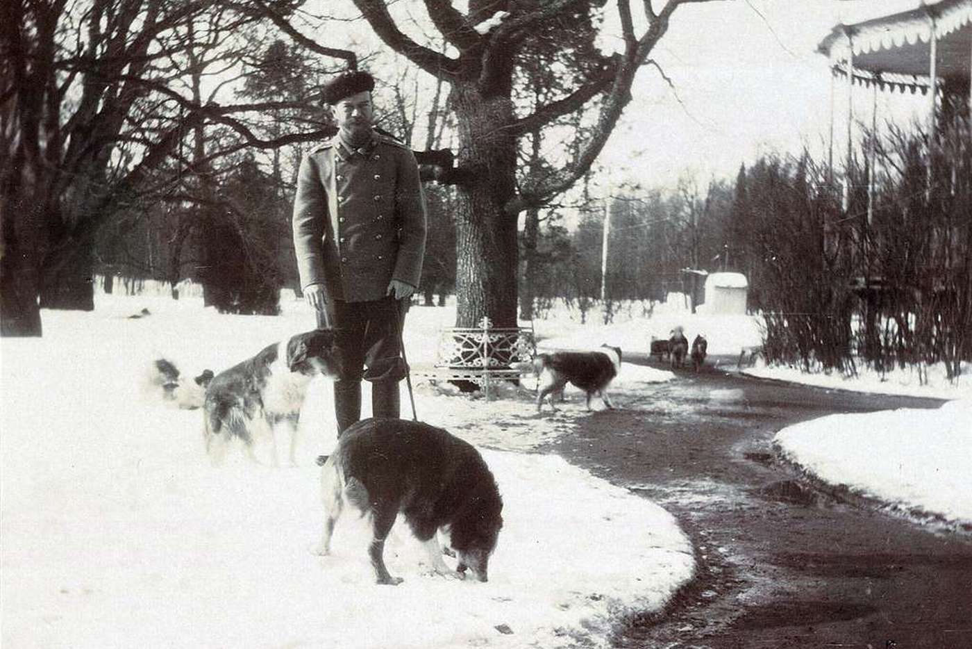 Car Mikuláš na procházce se psy na Carském Sele, 1910.