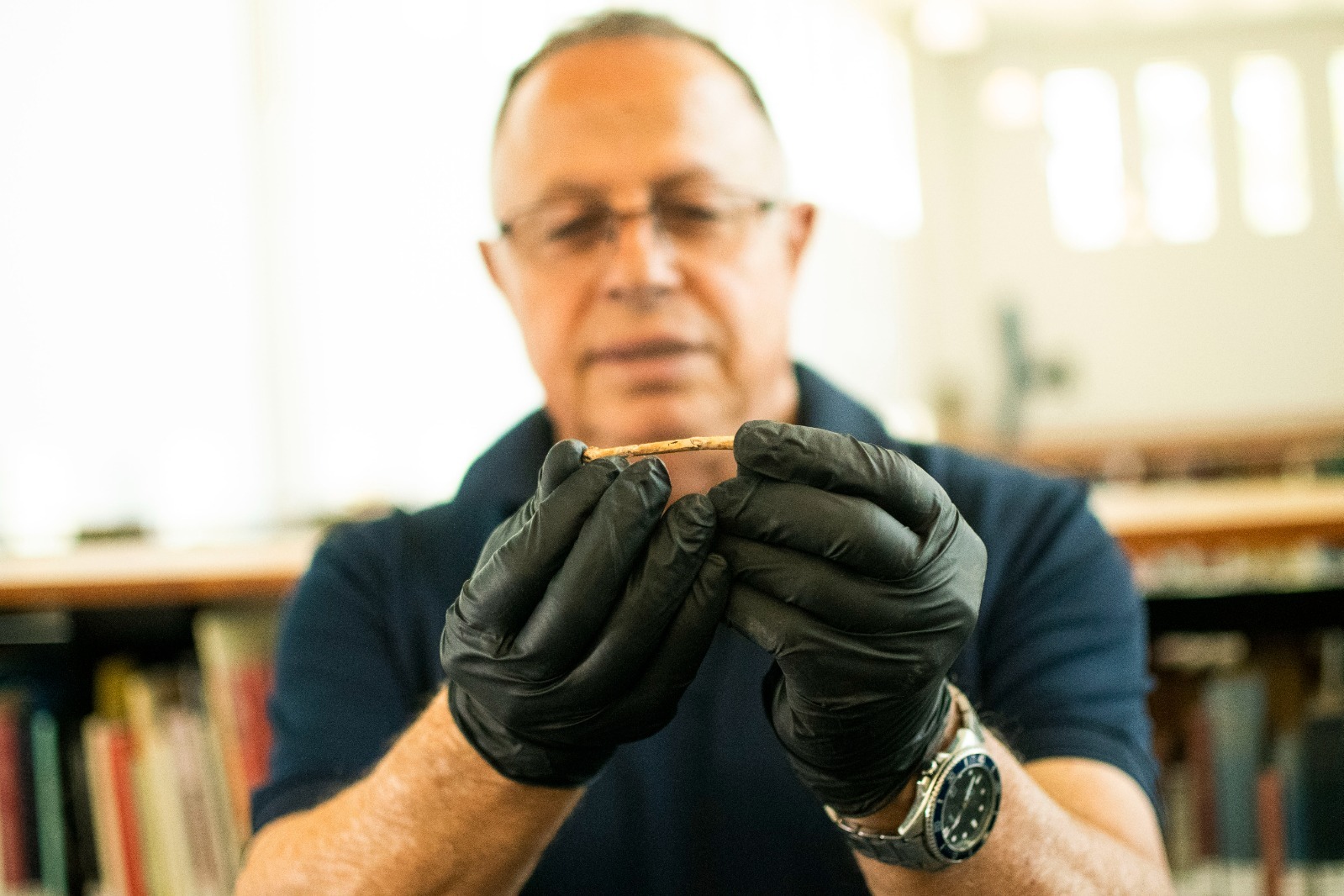 Dr. Hamoudi Khalaily s původní 12 000 let starou flétnou, objevenou v natufijské vesnici v severním Izraeli. (foto: IAA, Hamoudi Khalaily, CC BY-SA 4.0)