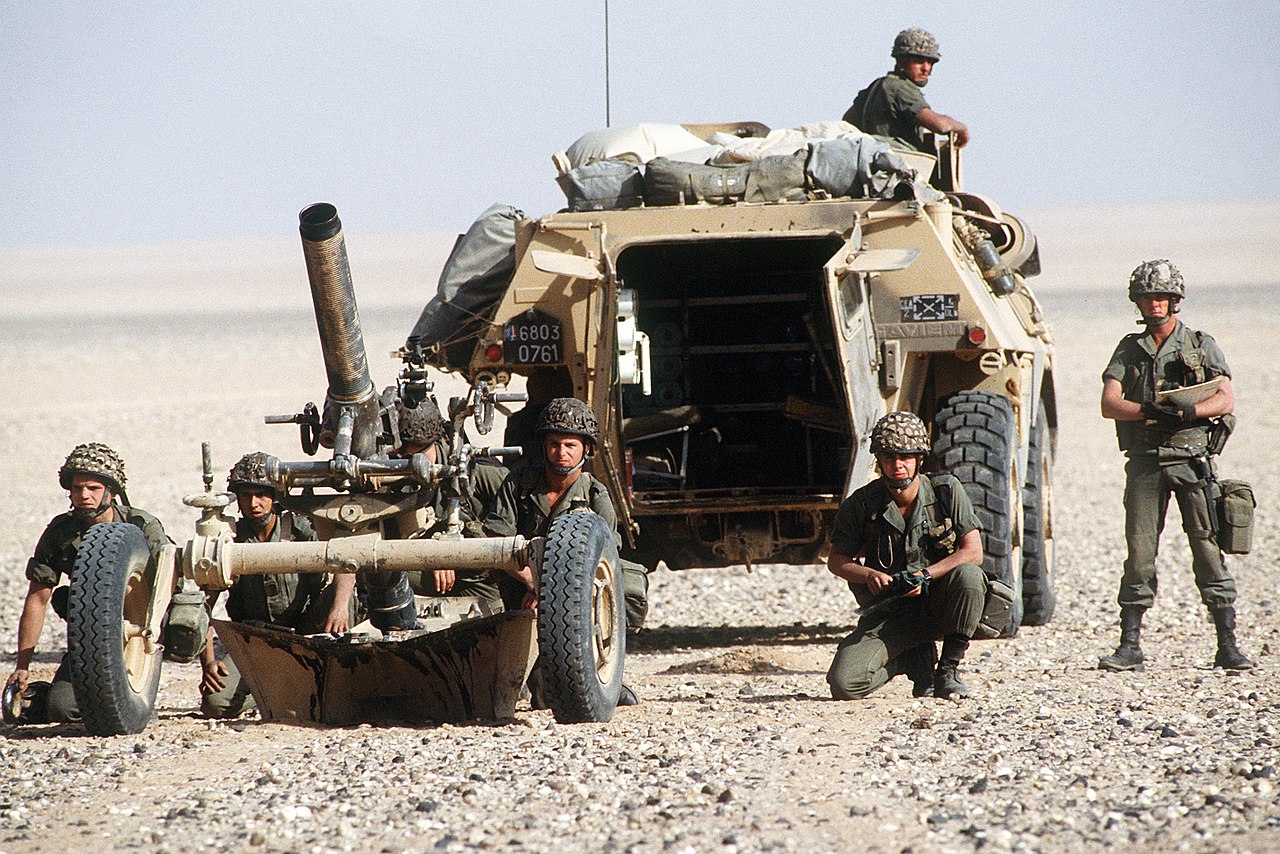 Cizinečtí legionáři se připravují k palbě ze 120 mm minometu během operace Pouštní štít. (foto: Wikimedia Commons, U.S. military, H. H. Deffner, CC0)