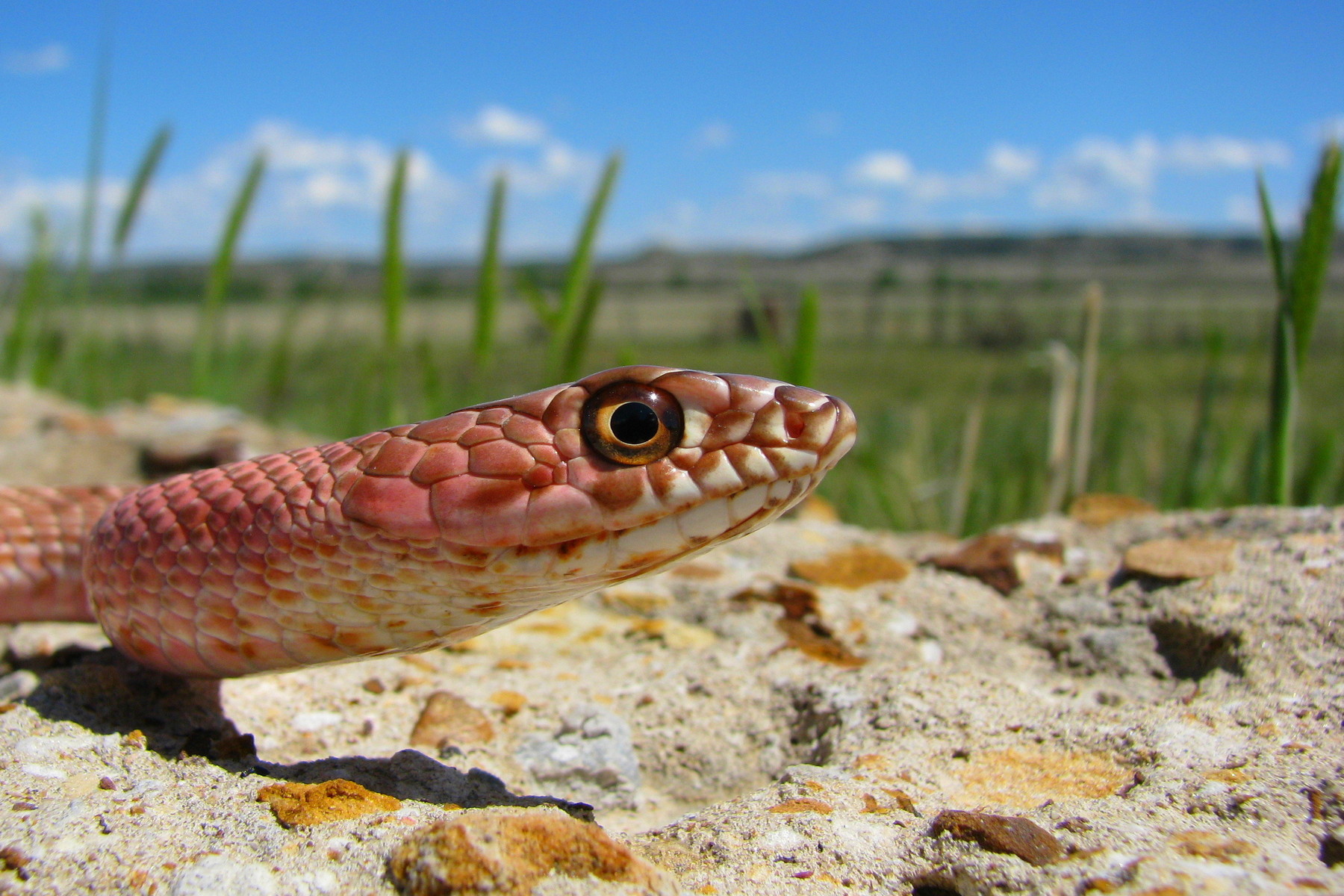 Jedna z barevných variant užovky pletené. Tento had má schopnost „vyčistit“ si v okamžiku nebezpečí ochrannou oční blanku od přebytečné krve v drobných žilkách. (foto: Shutterstock)