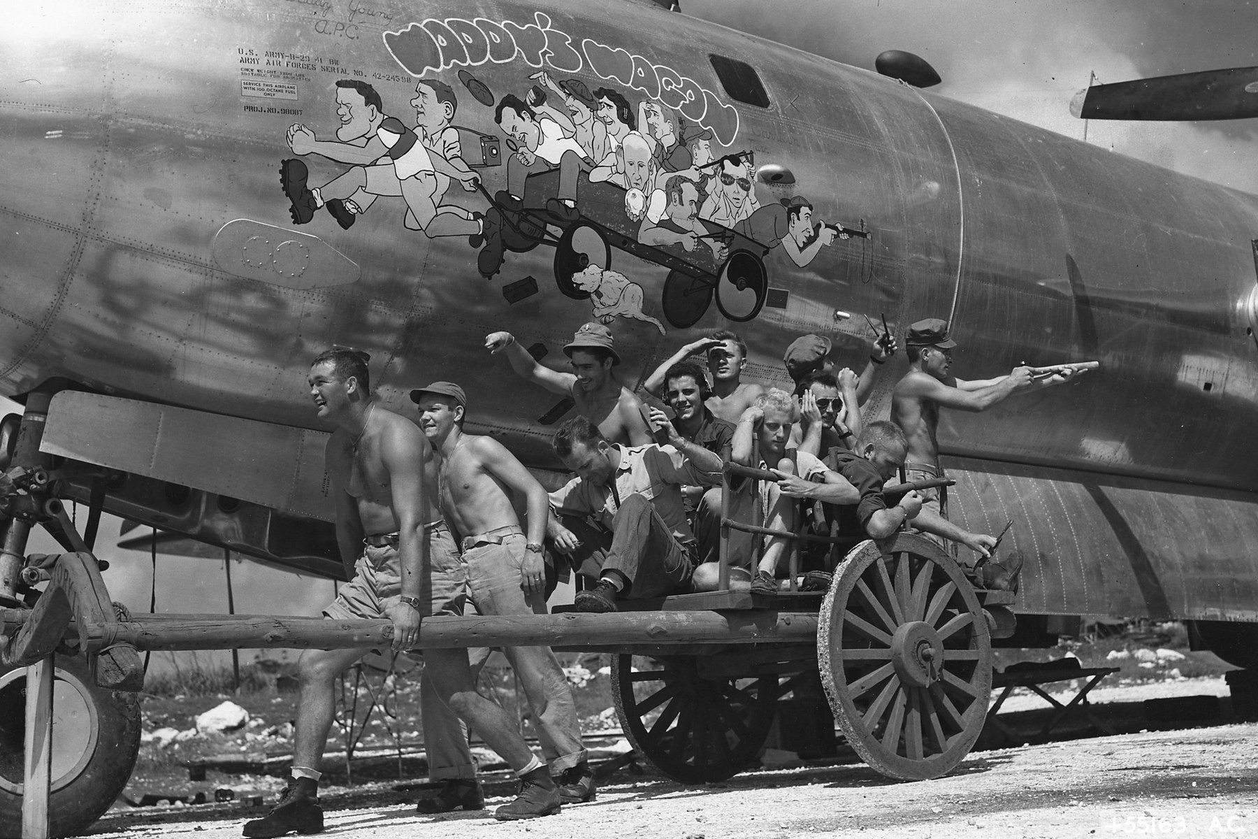 Osádku většiny verzí amerického bombardéru B-29 Superfortress tvořilo jedenáct mužů, kteří museli pracovat jako perfektně sehraný tým. Na snímku osádka 869. bombardovací perutě „Waddy's Wagon“, která se účastnila náletů na Tokio. (foto: Wikimedia Commons, NARA, CC0)