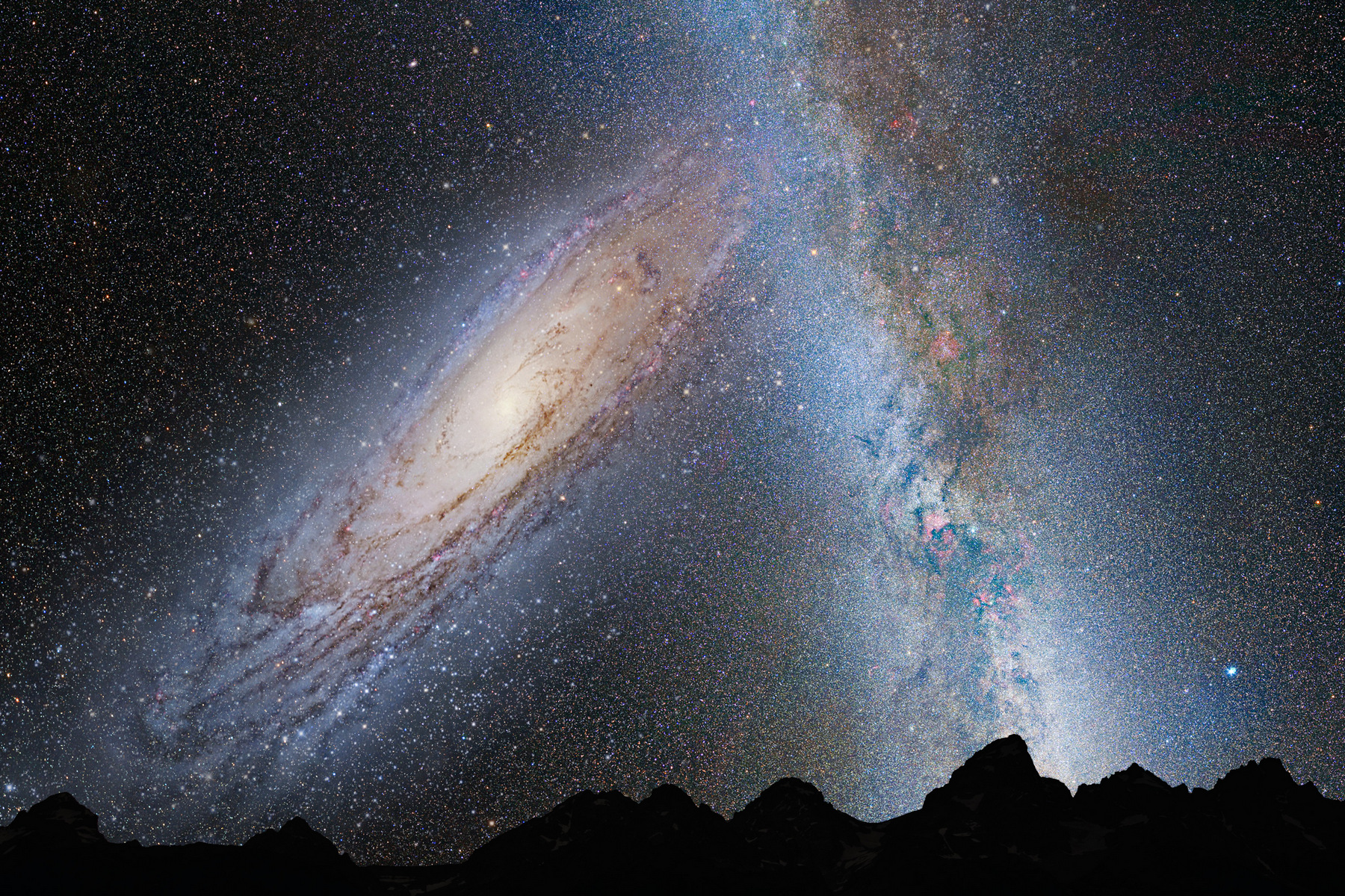Za 3,75 miliardy let se spojí do jedné Mléčná dráha a Galaxie v Andromedě. Hmotnost naší Galaxie určili astronomové na 1,5 × 10¹² ekvivalentů Slunce (1,5 bilionu Sluncí). K uvedené hodnotě dospěli pomocí měření rychlostí kulových hvězdokup, jež obíhají galaktické jádro. (foto: NASA, ESA, Z. Levay, R. van der Marel (STScI), T. Hallas, A. Mellinger, CC BY-SA 4.0)