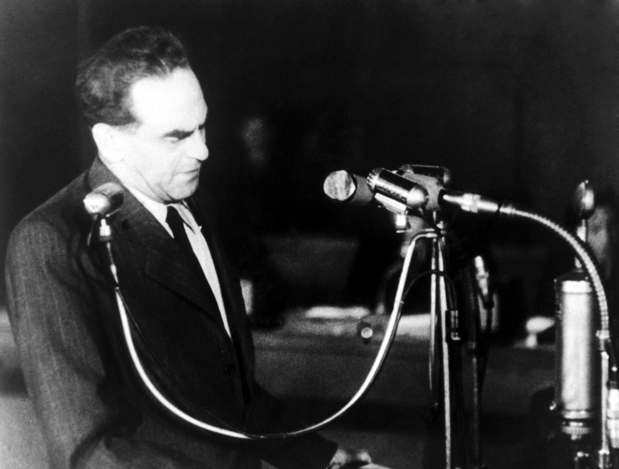 Rudolf Slánský při výslechu před senátem státního soudu v Praze.
