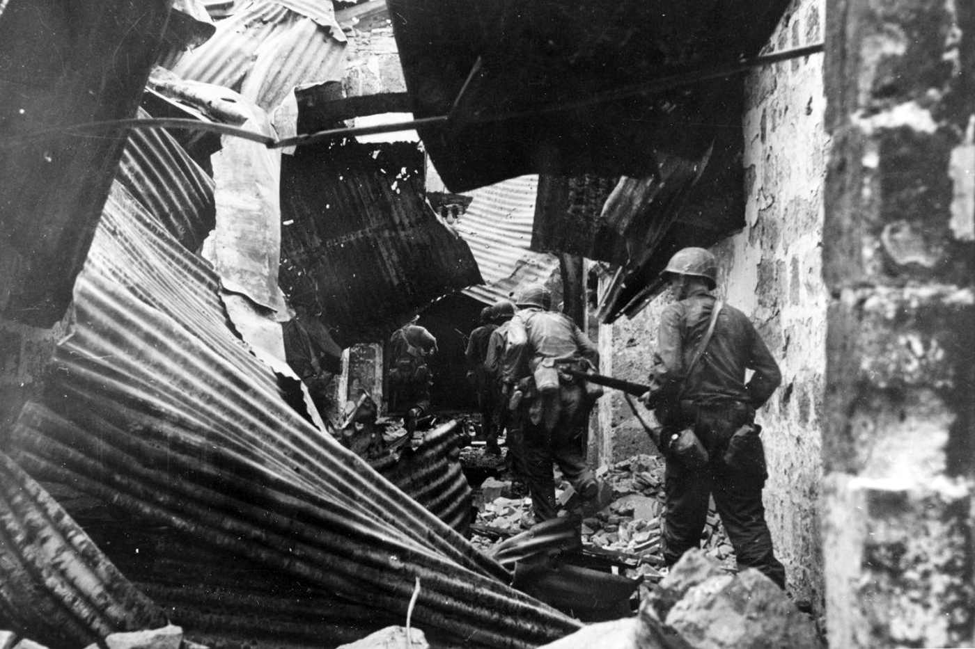 Američtí vojáci postupují v únoru 1945 troskami Manily. (foto: Wikimedia Commons, National Archives (NHHC), CC0)