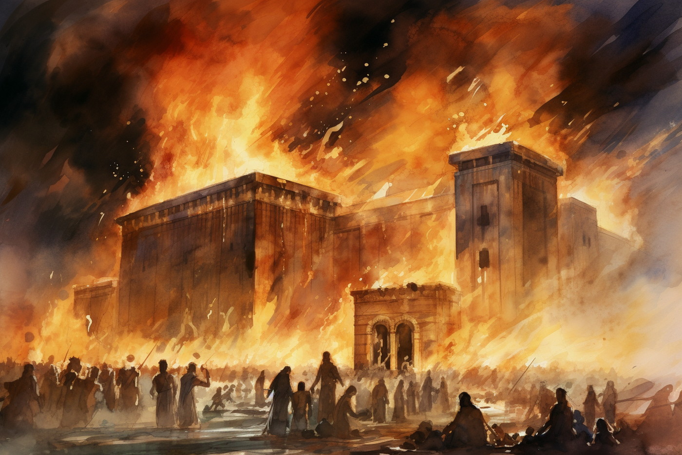 Zničení Šalomounova chrámu Babyloňany v roce 587/586 př. n. l. je významnou událostí ve starověkých dějinách Židů i v judaismu. (ilustrace: Midjourney AI, CC0)