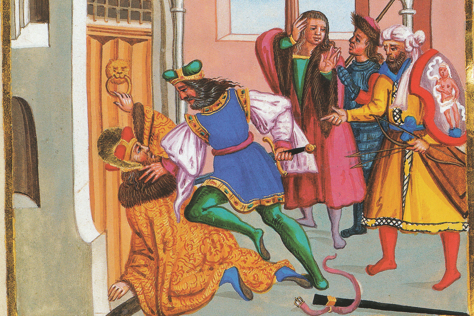 Vražda svatého Václava po hostině, během které se Strachkvas údajně narodil, iluminace z 2. poloviny 16. století. (ilustrace: Wikimedia Commons, CC0)