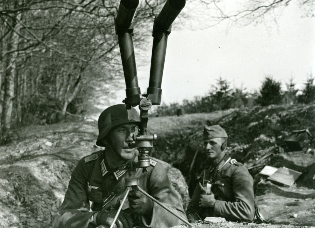 Němečtí pozorovatelé na francouzsko-německé hranici na přelomu let 1939 a 1940, stejný dalekohled využívali také jejich kolegové od dělostřelectva. (foto: Deutsches Historisches Museum, Berlin, Willi Huschke, CC BY-SA 4.0)