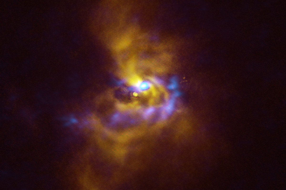 Hmota v blízkosti hvězdy V960 Mon - kombinovaný záběr z dat pořízených přístrojem SPHERE a radioteleskopem ALMA. (foto: ESO/ALMA, Philipp Weber, CC BY-SA 4.0)