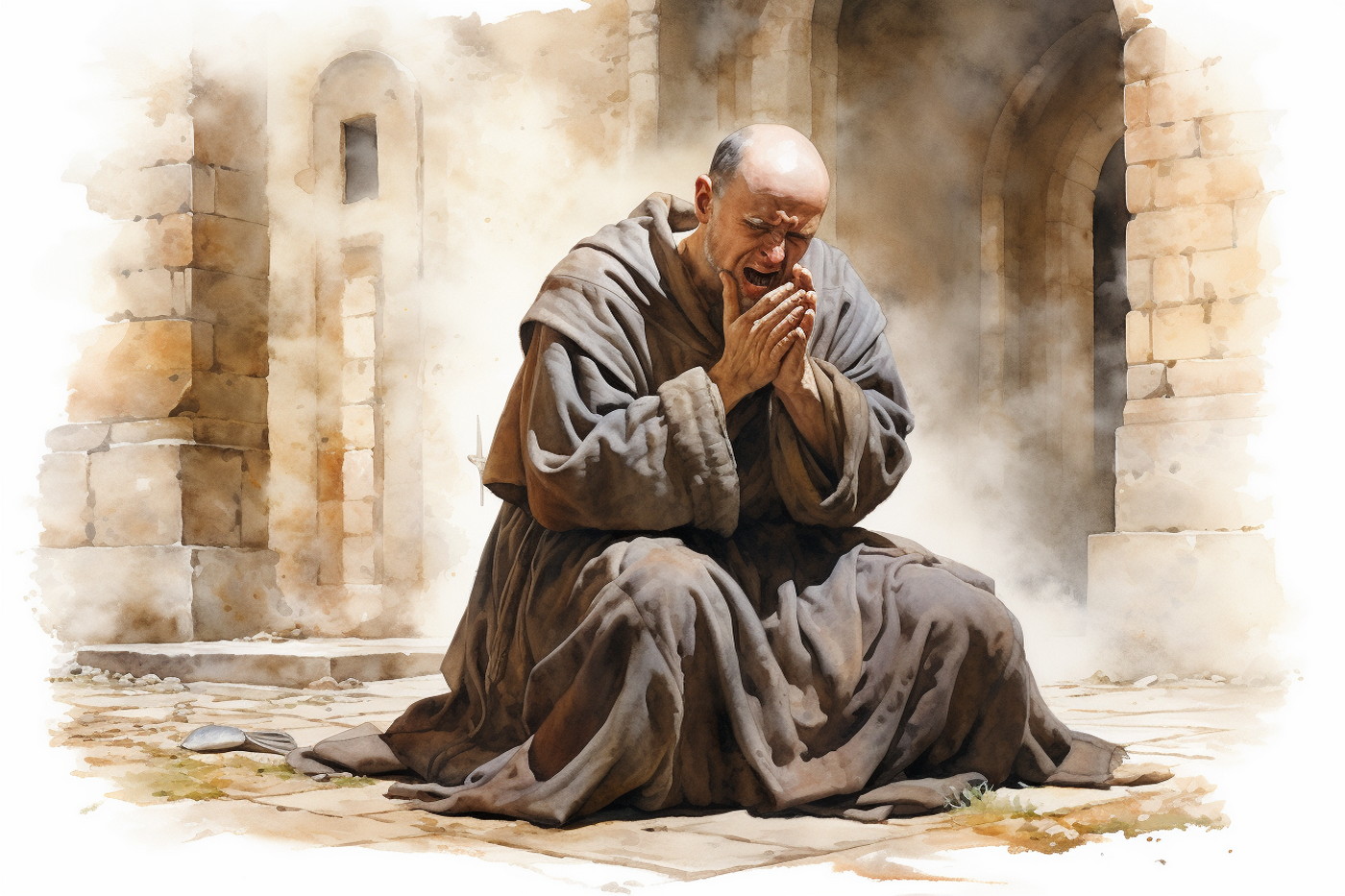 U lehkých provinění musel cisterciácký mnich veřejně přede všemi prosit za odpuštění, aniž by měl možnost se hájit. (ilustrace: Midjourney AI, CC0)