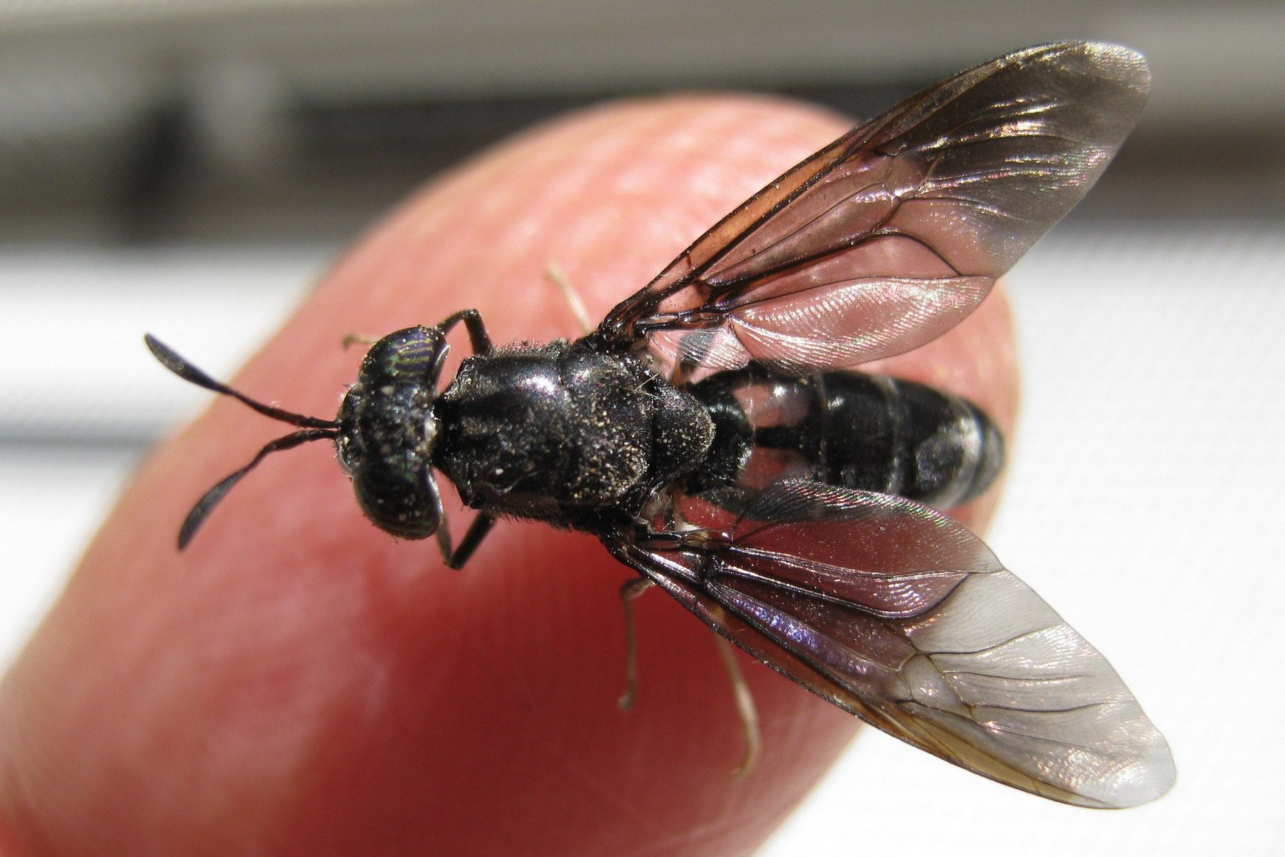 Bráněnka Hermetia illucens. Její larvy jsou zdrojem vysoce kvalitního hmyzího proteinu. (foto: Wikimedia Commons, Beatriz Moisset, CC BY-SA 4.0)