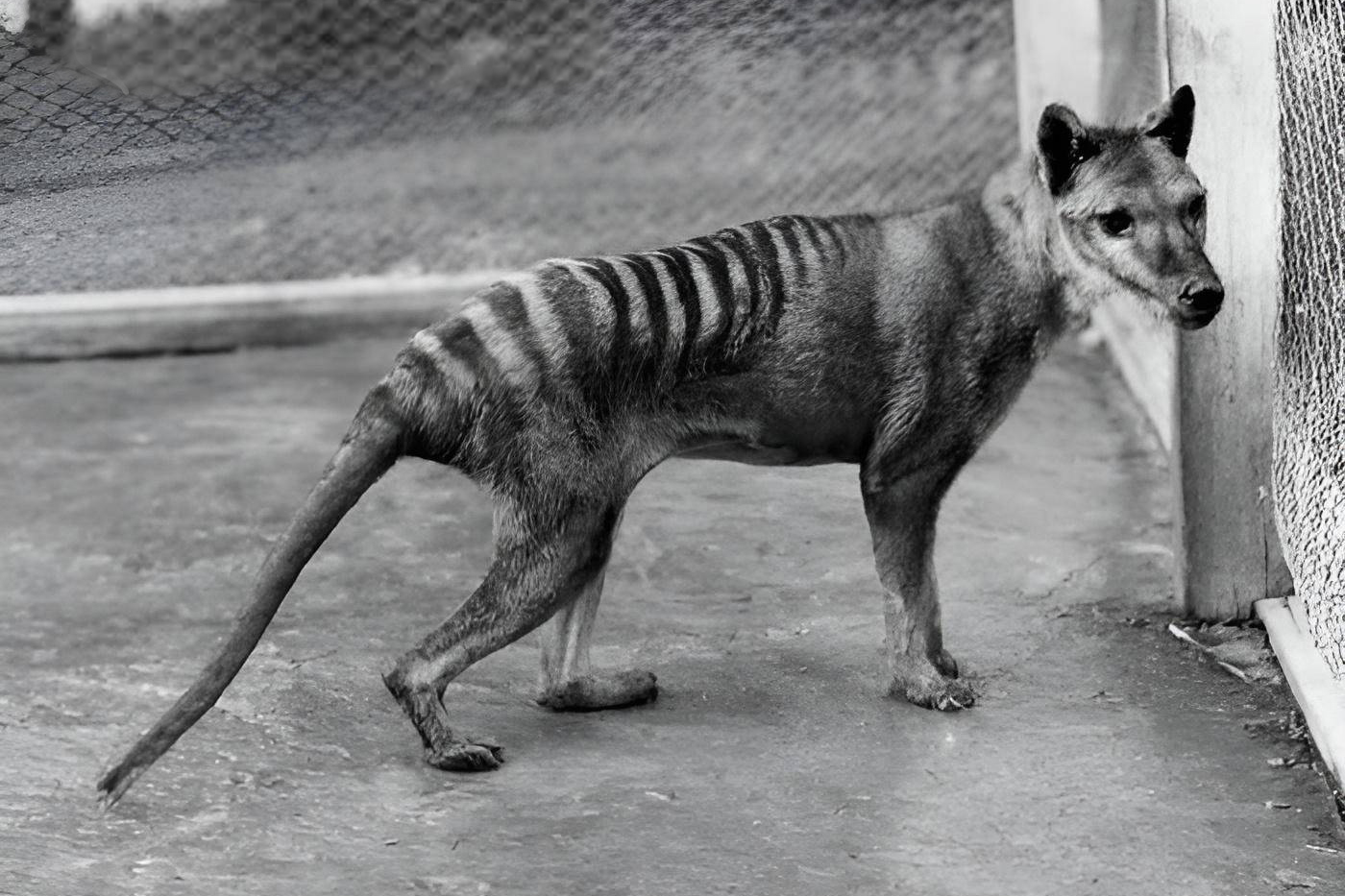 Vakovlk tasmánský na snímku z Hobartské zoologické zahrady v roce 1928. Zvíře zemřelo den po pořízení fotografie. (foto: Wikimedia Commons, Benjamin A. Sheppard, CC0)