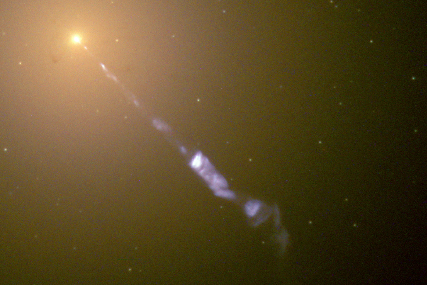 Výtrysk plazmatu ze středu galaxie M87 se šíří téměř rychlostí světla do vzdálenosti okolo 5 000 světelných let. (zdroj: NASA/ESA, Hubble, CC BY 4.0 DEED)