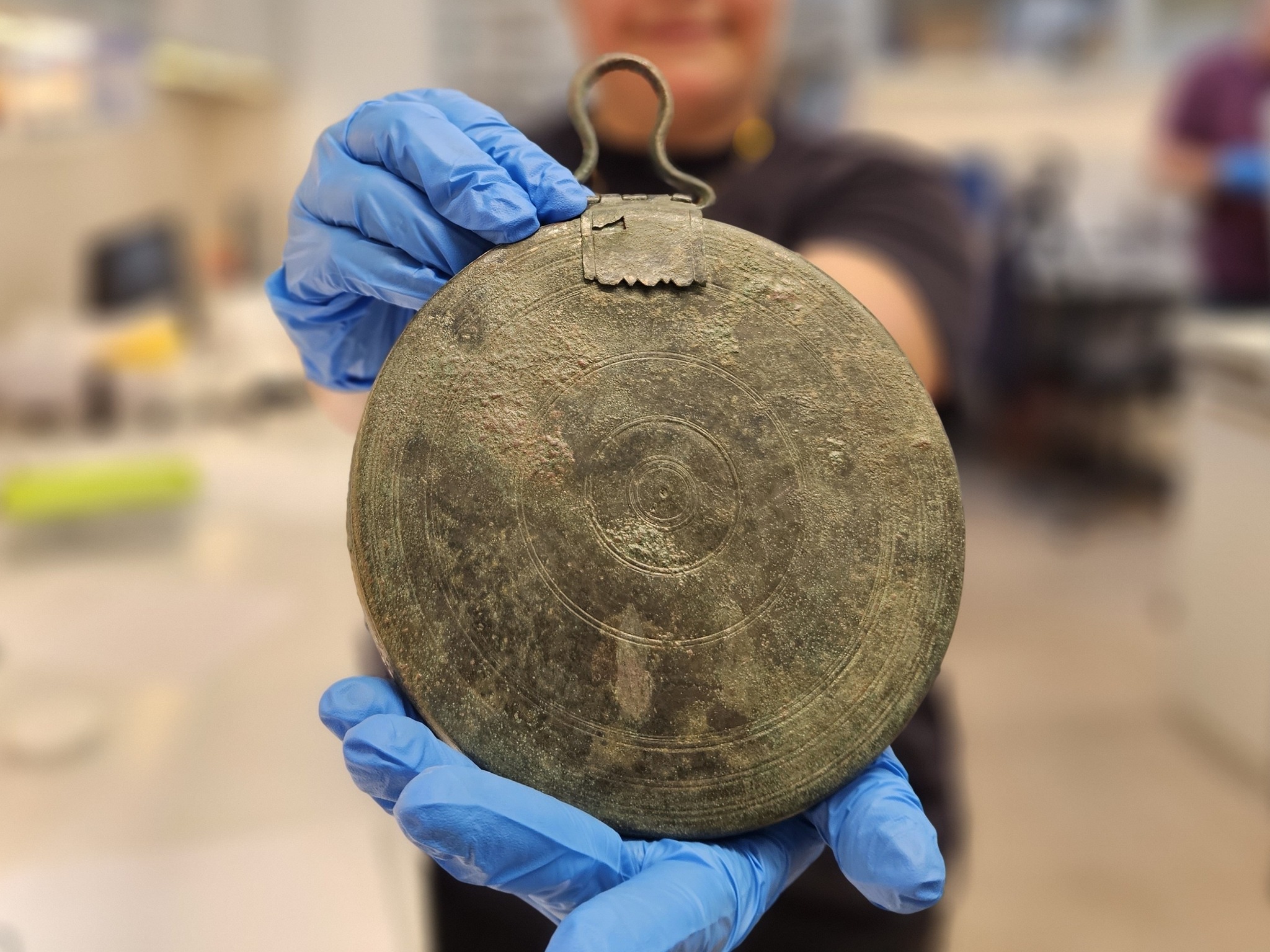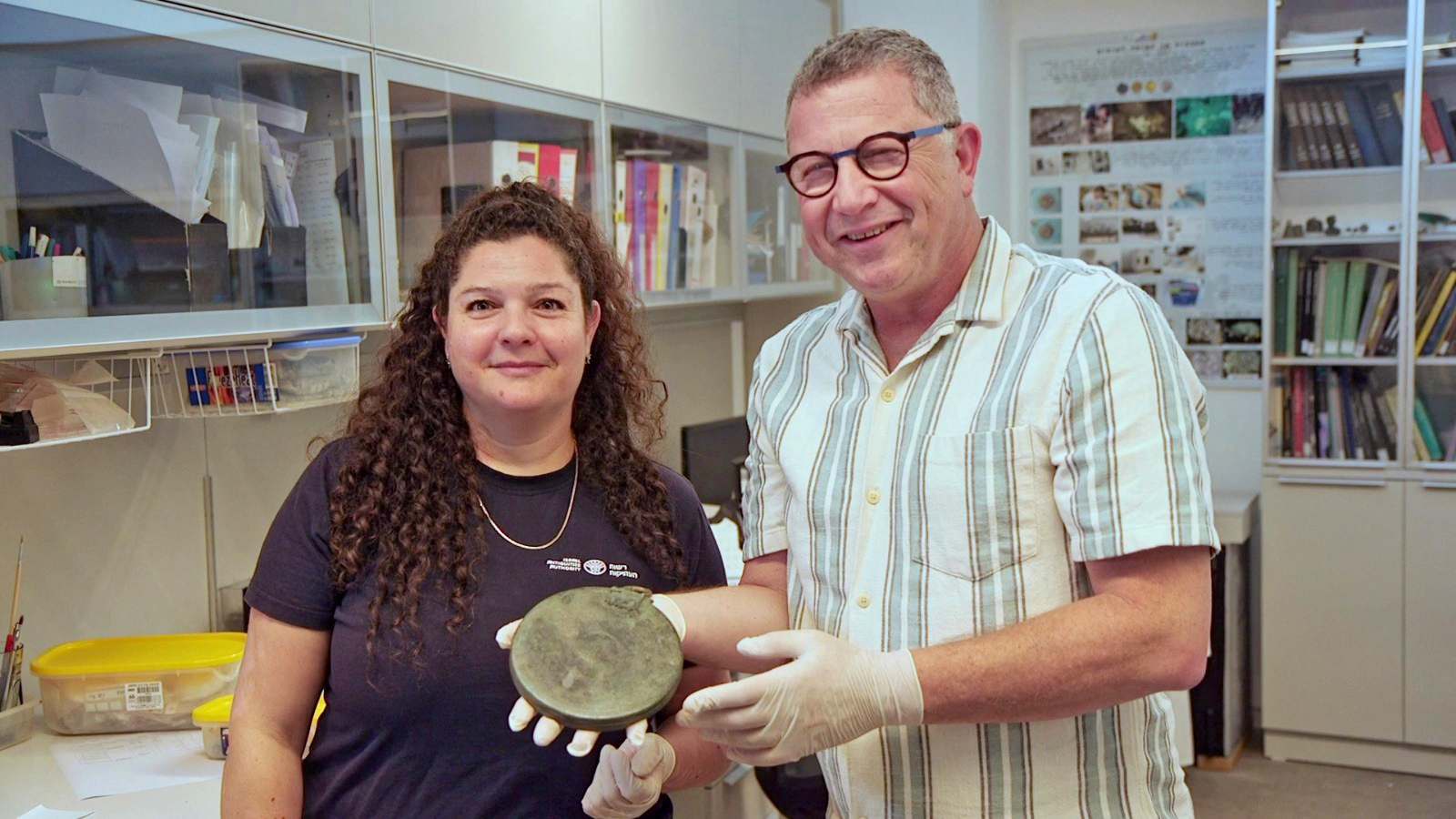• Nalezené zrcadlo označují archeologové jako velkou vzácnost. Na celém světě jich bylo nalezeno 63 kusů, 61 z nich ale na území Řecka. (foto: Israel Antiquities Authority, Yoli Schwartz, CC BY-SA 4.0)