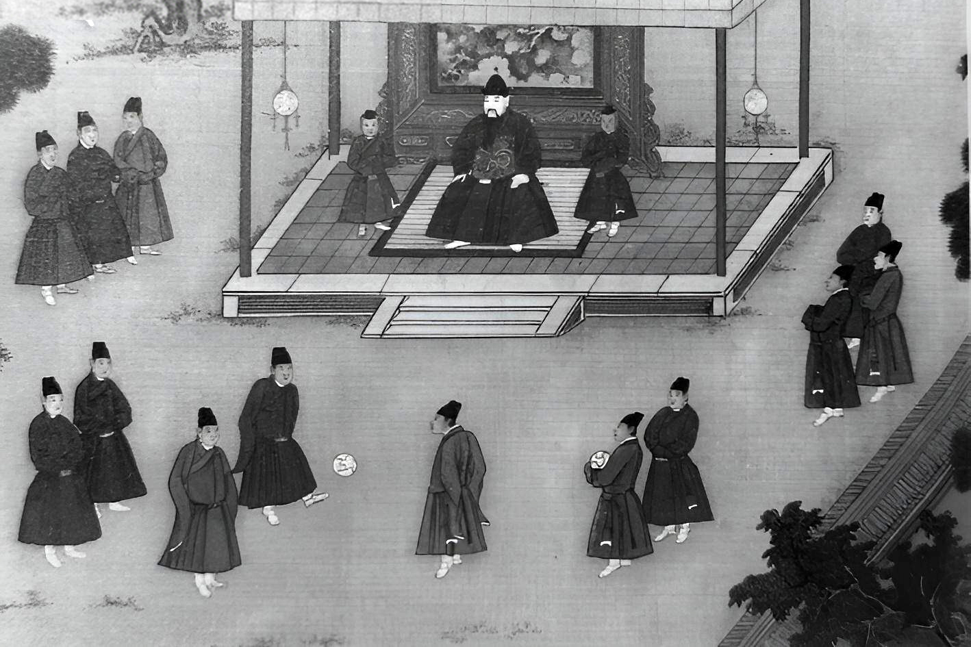 Císař Jung-le pozoruje eunuchy hrající míčovou hru cchu-ťü.
