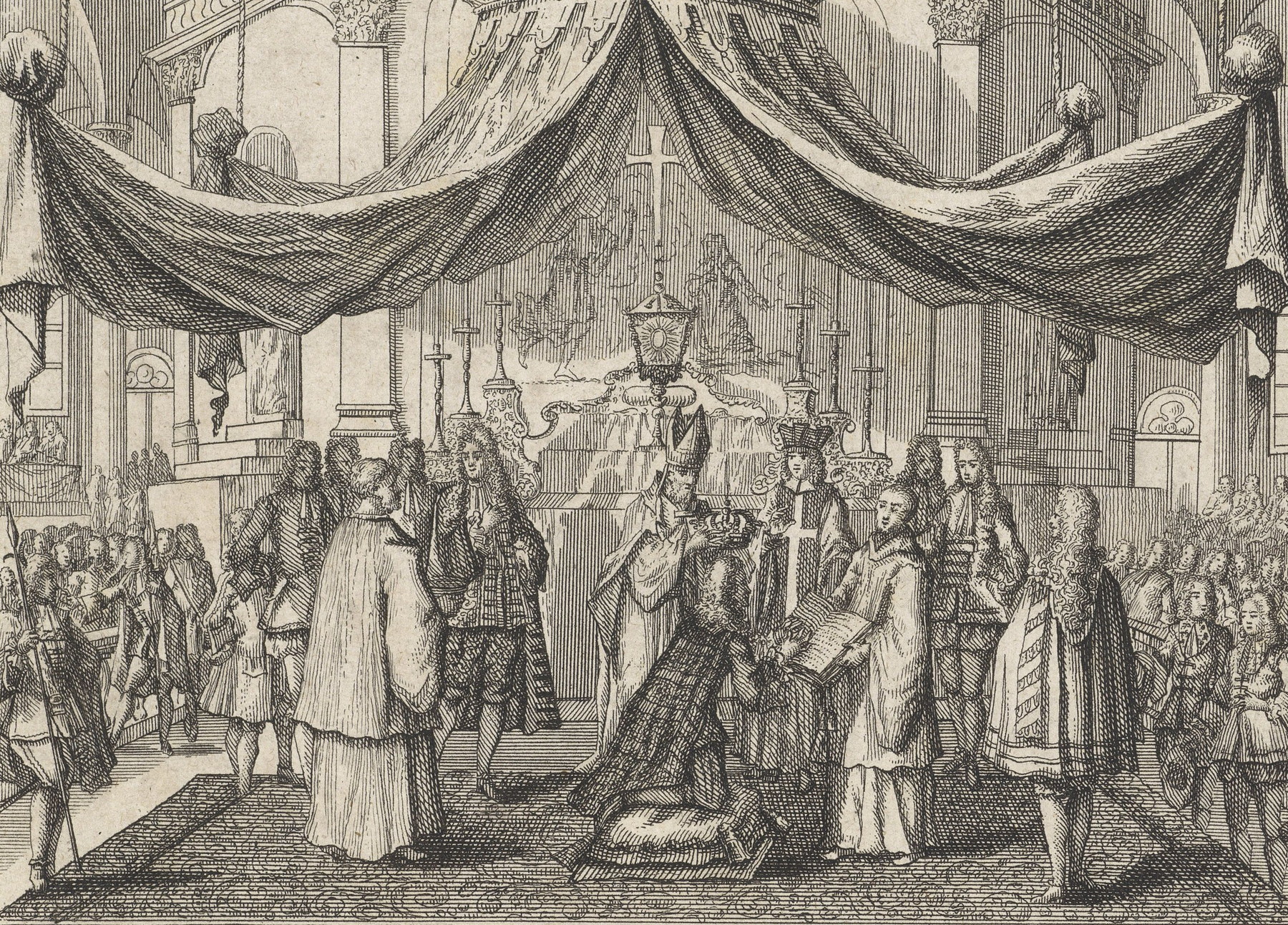 Pražská korunovace: Karel VI. přísahá na Písmo svaté, zatímco arcibiskup drží nad jeho hlavou korunu. (ilustrace: Wikimedia Commons, Rijksmuseum, CC0 1.0)