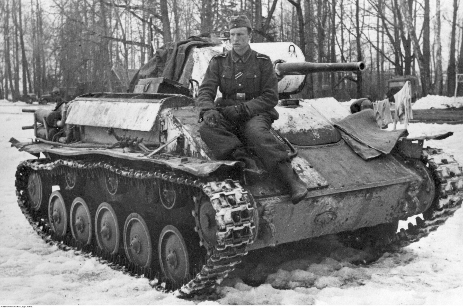 Německý pěšák pózuje na ukořistěném tanku T-70.