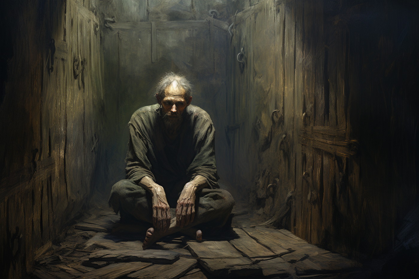 Vězeň, na kterého se záměrně „zapomnělo“ vyšel ze svého vězení jako troska. (ilustrace: Midjourney AI, PDM 1.0)