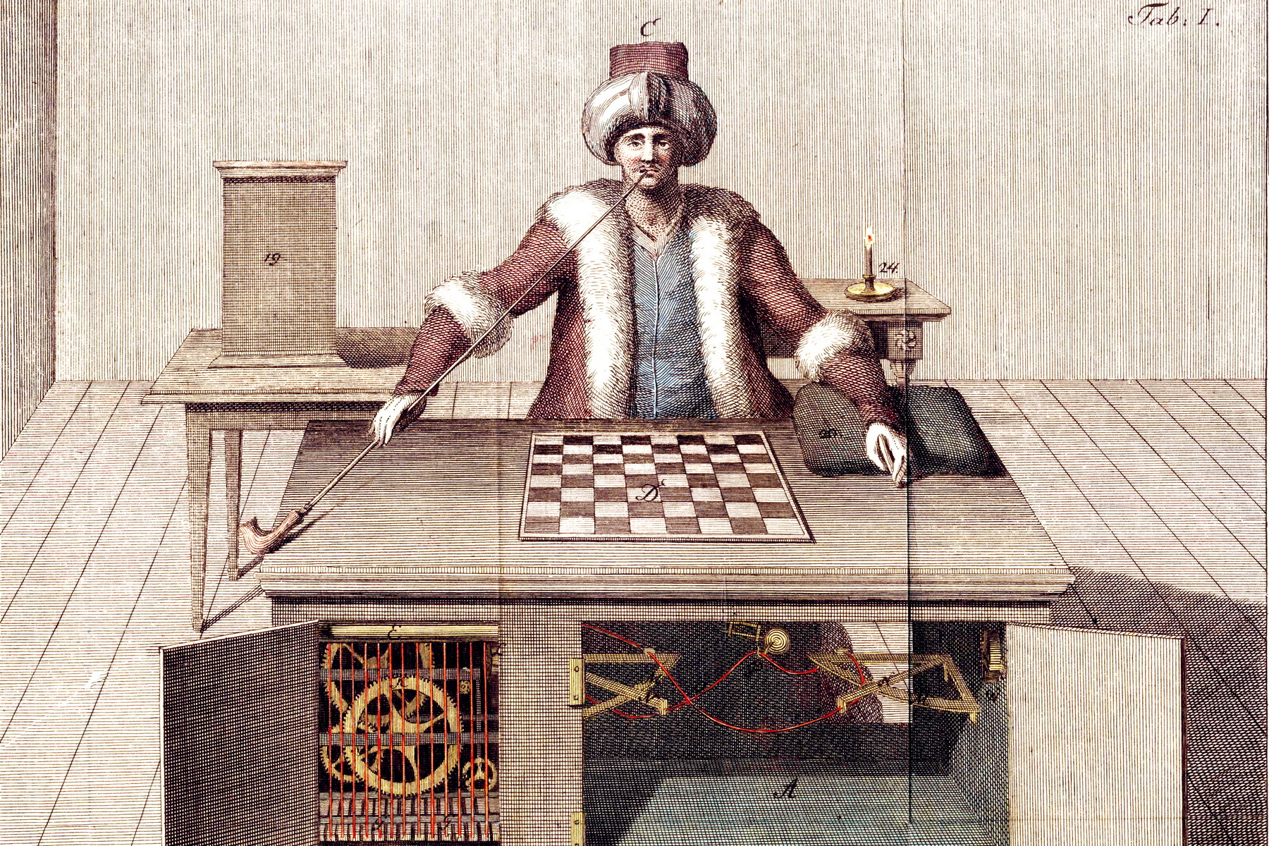 Šachista Turek měl být zázrakem mechaniky a první myslící počítač. Většina předváděných součástek měla ale skrývat pravou podstatu „stroje“. (ilustrace: Wikimedia Commons, Humboldt University Library, PDM 1.0)