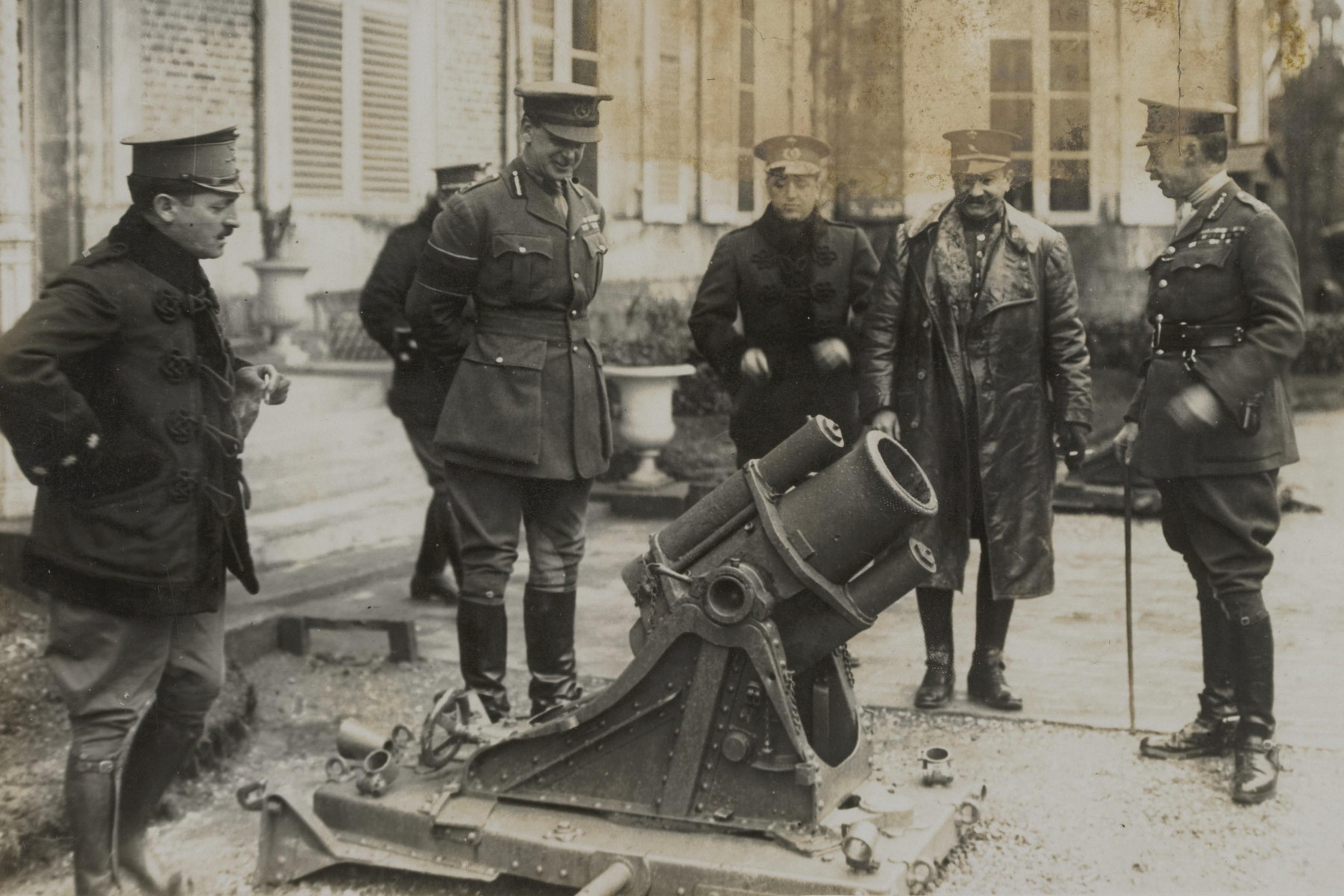 Henry Rawlinson (zcela vpravo) patřil k hlavním představitelům britské armády. Na snímku se španělskými důstojníky, jimž ukazuje ukořistěný německý minomet. (foto: Wikimedia Commons, Nationaal Archief, CC0 1.0)
