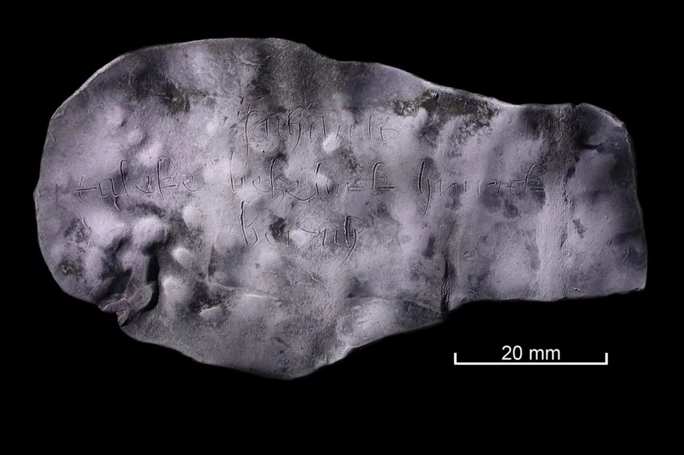 Objevený kousek olověné destičky se sotva patrnou kletbou. (foto: Archeology in Mecklenburg-Western Pomerania (AIM-V), CC BY-SA 4.0)