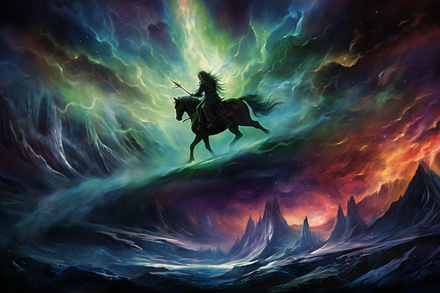 Při spatření polární záře na zimní obloze si seveřané nejčastěji vyprávěli příběhy o neblahých znameních, posmrtném životě a nebezpečných příšerách. (ilustrace: Midjourney AI, PDM 1.0)