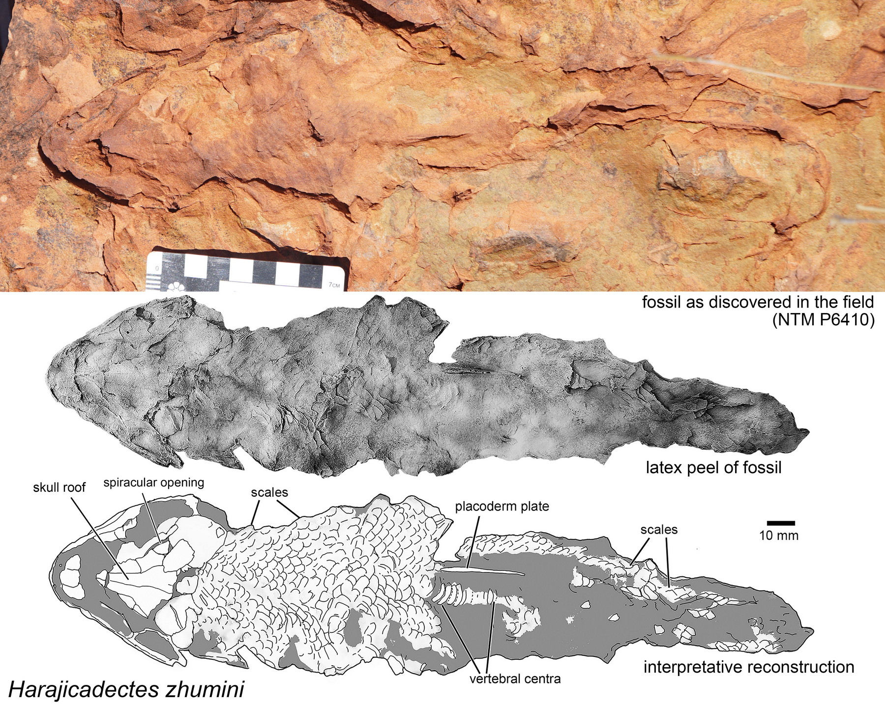 • Ilustrace pravděpodobné podoby Harajicadectes zhumini, nepříliš vzdáleného příbuzného ryb, ze kterých se později vyvinuli nejstarší čtyřnožci. (zdroj: Flinders University, Brian Choo, CC BY-SA 4.0)