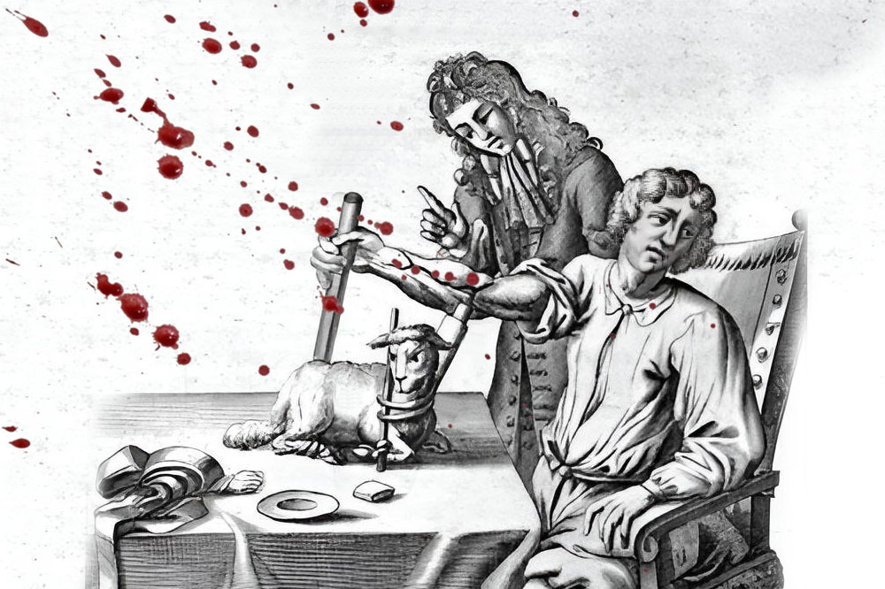 První úspěšná transfuze krve u člověka na vyobrazení z roku 1705. (ilustrace: Wikimedia Commons, Wellcome Library, PDM 1.0)